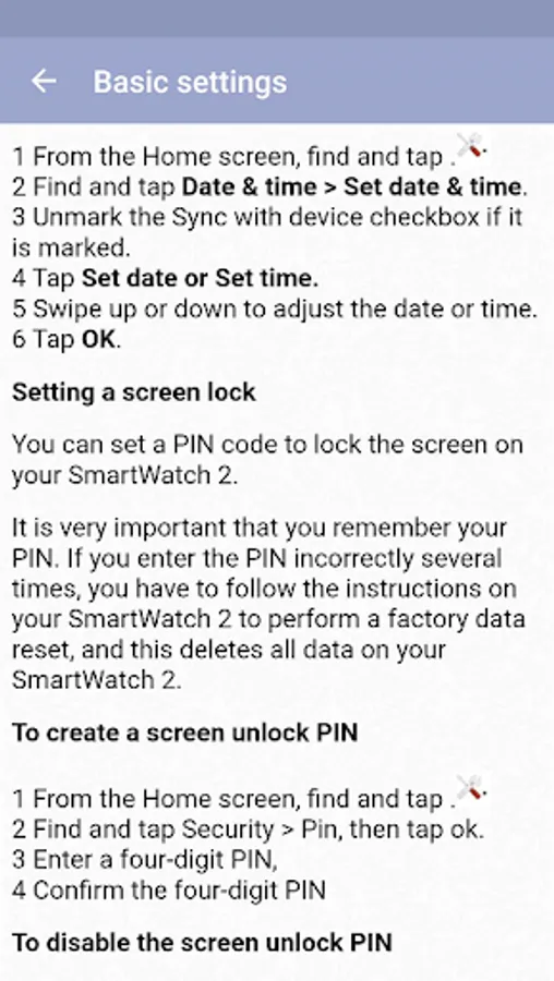 This mobile application is a guide that gives information about sony smart watch sw2. From this app, you can get information about device settings, smartwatch 2 setup, screen lock setting, charging the device, software update and Smartwatch sw 2 watch face change.
