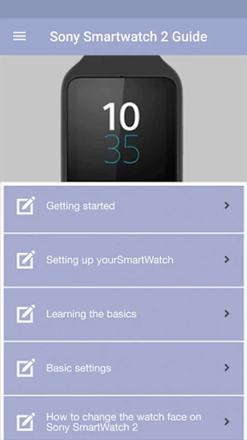 This mobile application is a guide. It is not an official app or part of an official app product. Download this guide to learn about sony smart watch sw2.