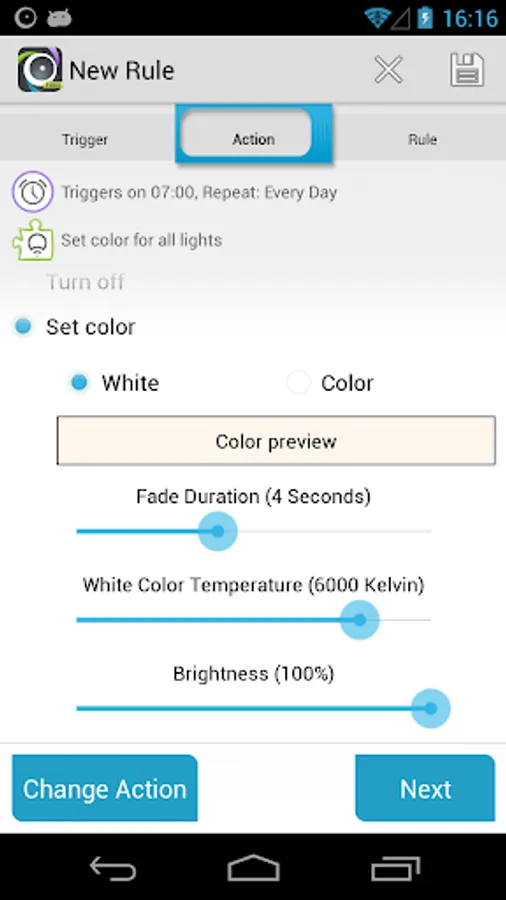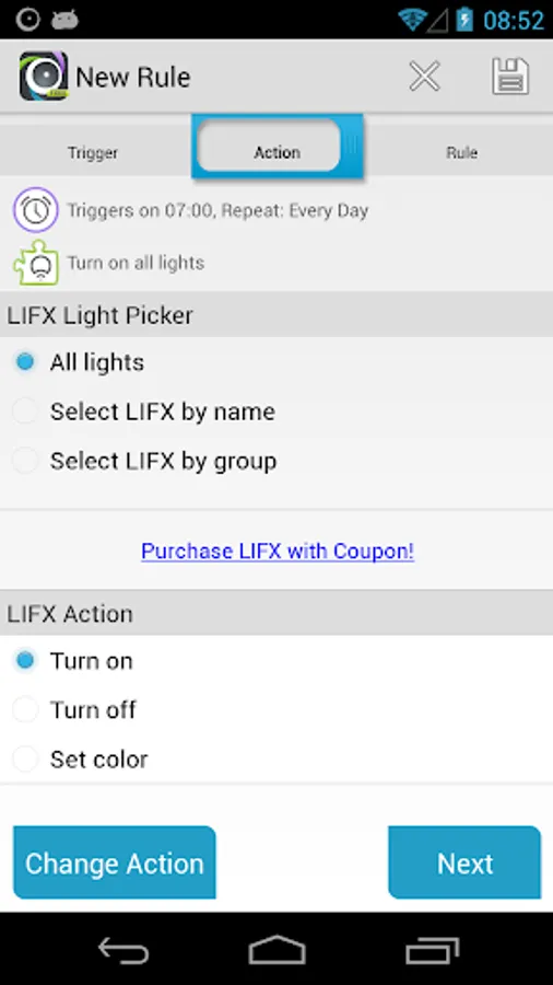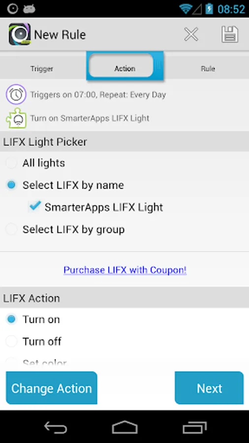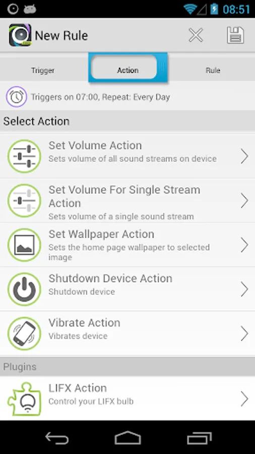 This plugin adds an action to AutomateIt so that you can turn on/off your LIFX light bulb or set its color using any trigger (Time, SMS, Wifi connection etc).