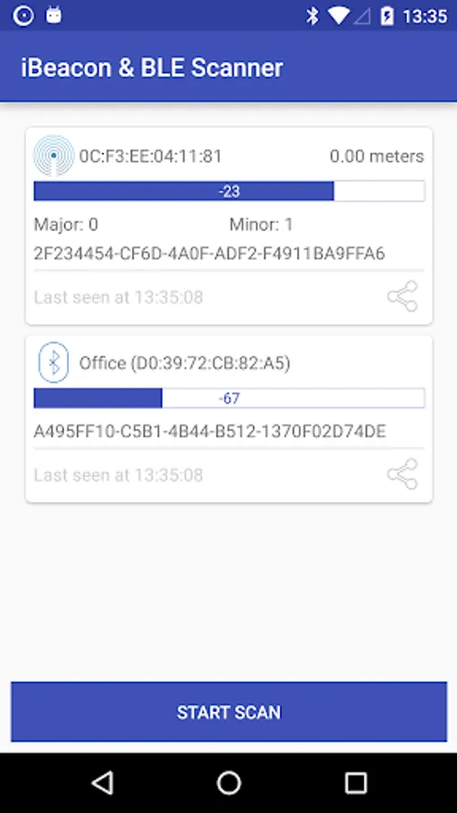 Easily find nearby iBeacons and Bluetooth Low-Energy devices, track the signal strength and other attributes of each device.