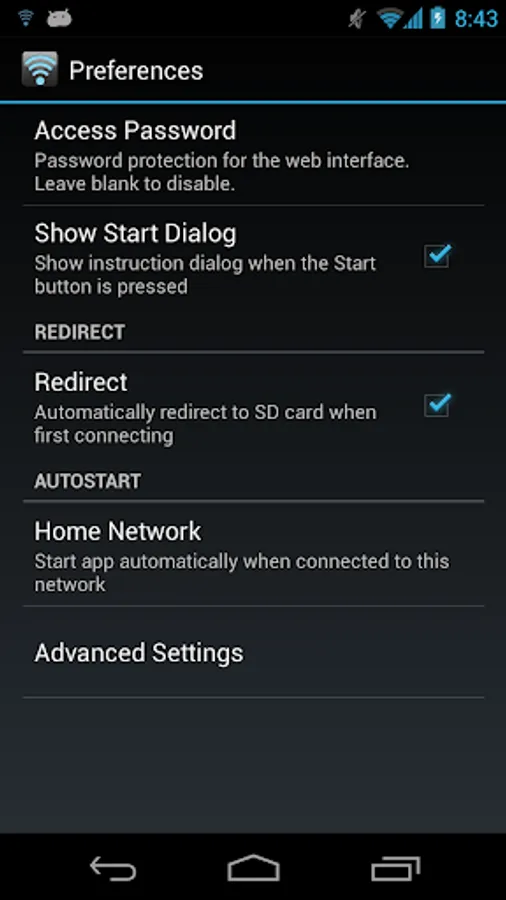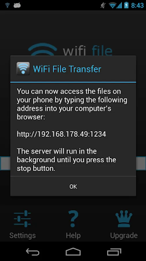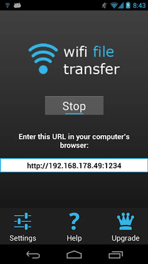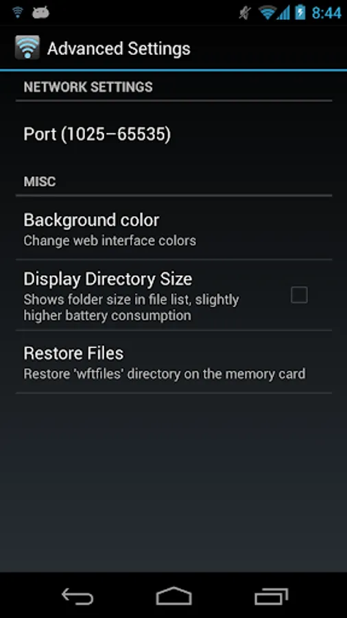 • If you're using WiFi File Transfer alongside other server apps such as WebSharing or Kies Air, make sure they do not use the same port number.