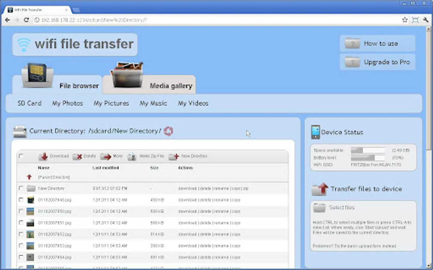 WiFi File Transfer lets you upload and download files to/from your phone or tablet over a wireless connection. Easy-to-use web interface, no USB cable needed.