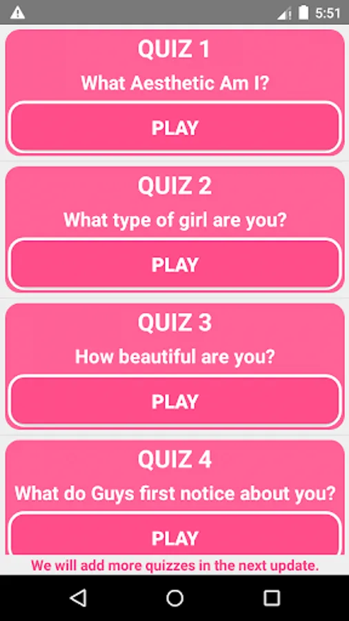 There are many quizzes and personality tests that you can take about different topics, the first quiz is about What Aesthetic Am I? and it has four results: Spooky beauty, Edgy beauty, Edgy beauty and Natural beauty and the second quiz is about What type of girl are you? and it has four results: Princess, Fair Maiden, Rebel and Warrior, and the third personality test is about How beautiful are you? and it has five results: Classic, Natural, Angelic, and Modern Beauty and many other quizzes about what is my zodiac sign and Personality color test and we will add more quizzes in the future.
