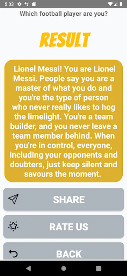 If you have enjoyed this app about Which Football Player Are You? then please rate it 5 stars and share it, don't forget to write your review to motivate us to do more apps like this in the future.