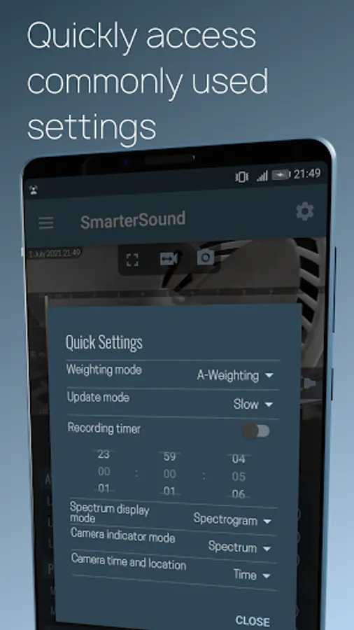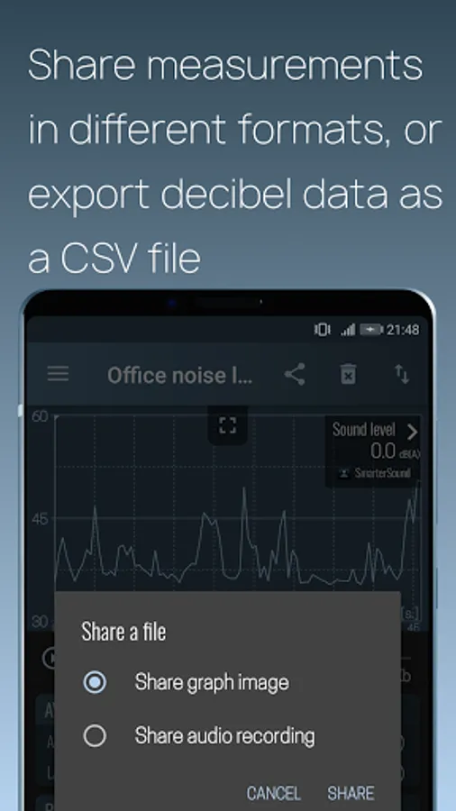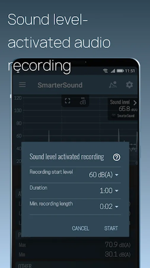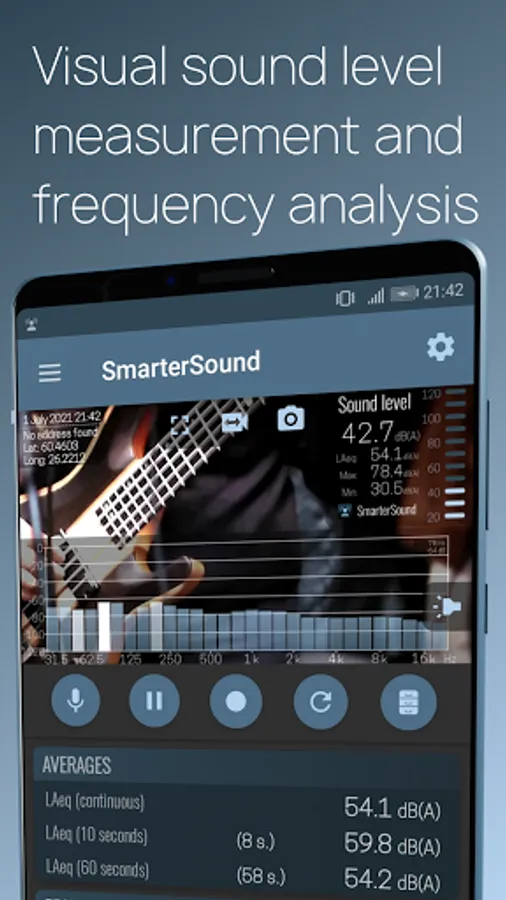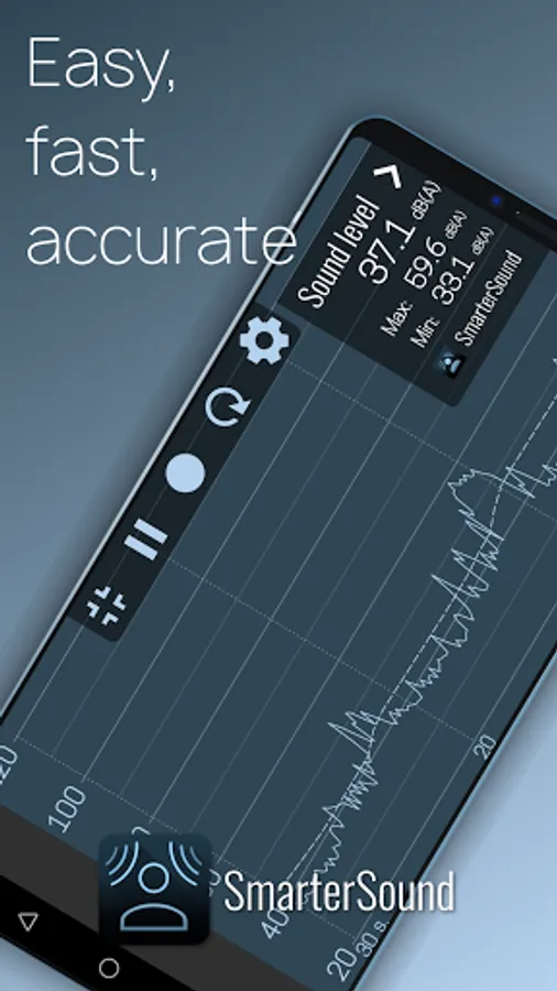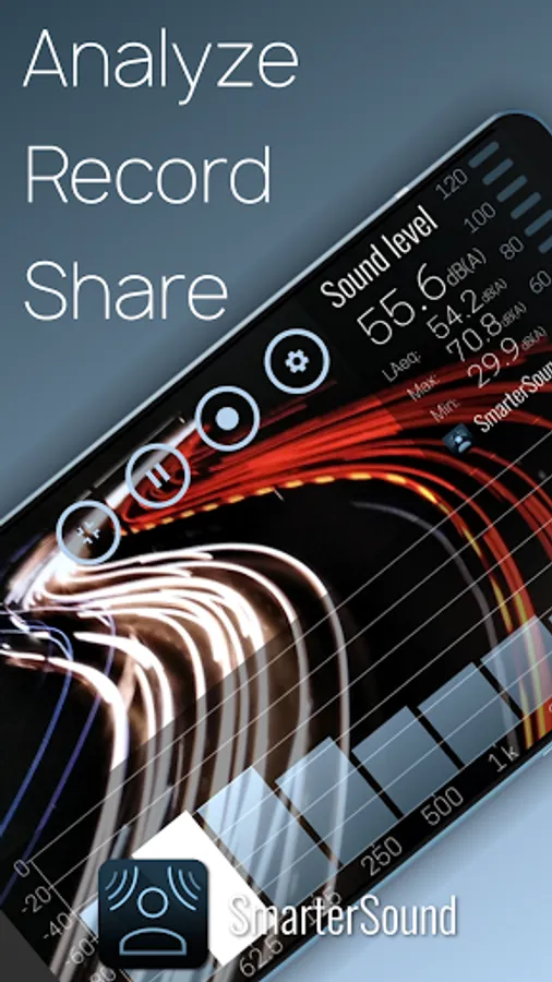 SmarterSound is the ad-supported version of the SmarterNoise Pro recording sound analyzer. It contains all the advanced sound analysis and recording features of SmarterNoise Pro, such as a frequency spectrum display, export of measurement data, a sound level meter with A-, C- or no sound level frequency weighting, and full screen modes for both video and audio recording.