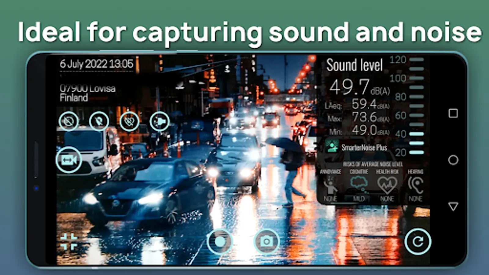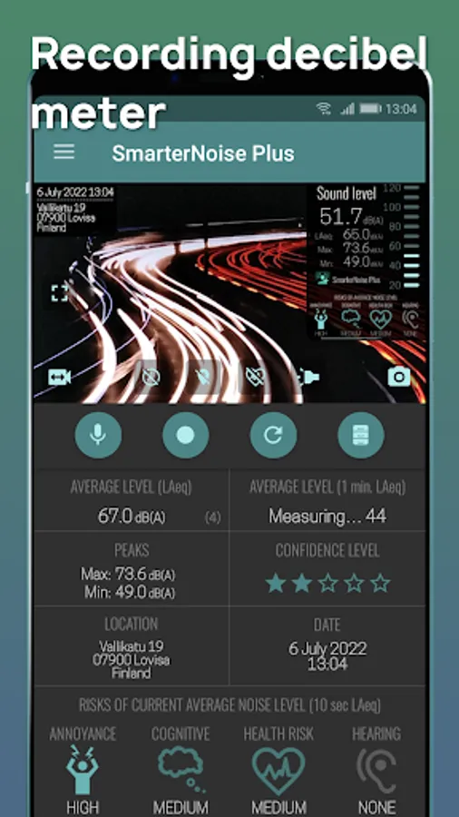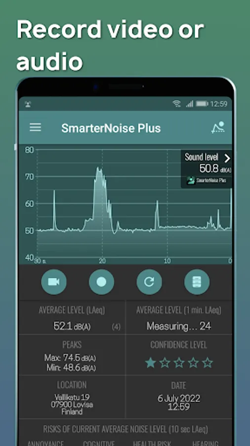 SmarterNoise Plus is a premium sound level meter app featuring several unique functions. SmarterNoise Plus measures sound levels in video and audio format, records video and sound, and informs you about the risks of noise exposure. In addition, SmarterNoise Plus includes a camera, gps-location, and easy sharing, all for free. From the archive you can go back to the video and audio files you saved on your phone. With SmarterNoise Plus you take sound level and noise measuring to a new level never available before.