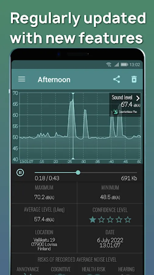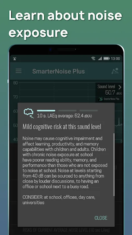 SmarterNoise Plus features smart icons that react to the measured sound levels based on current research results focusing on the health and well being effects of noise pollution. With the SmarterNoise icons you easily understand how hearing, cognitive performance, and health may be effected during different levels of noise exposure. The awareness of harmful noise is increasing globally, and is considered a versatile risk factor for wellbeing and health, especially in noise polluted urban environments.