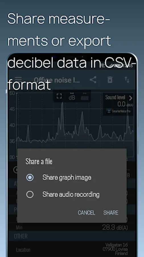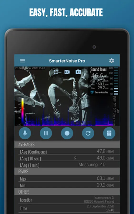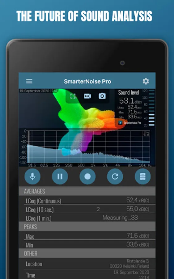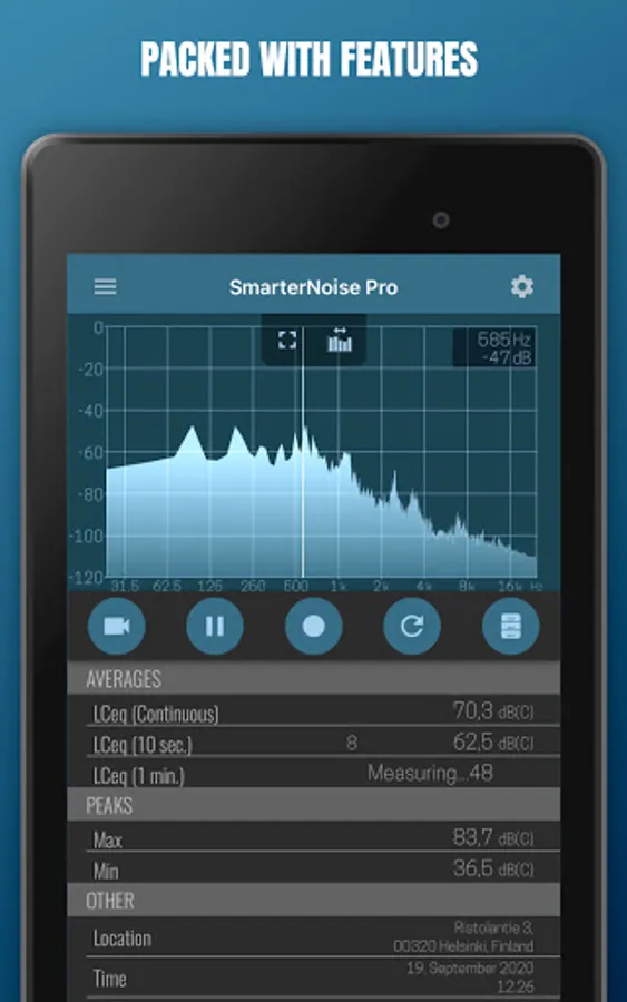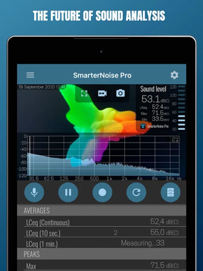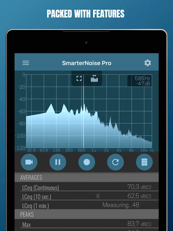 SmarterNoise Pro is the most advanced edition of the SmarterNoise recording sound level meters. Our Pro edition decibel meter is developed especially with more advanced measurements in mind, and includes many requested features such as a frequency spectrum display, export of measurement data, A-, C- or no weighting, and full screen audio measurement. Our Pro edition does not contain any advertising, and performs accurately and fast.