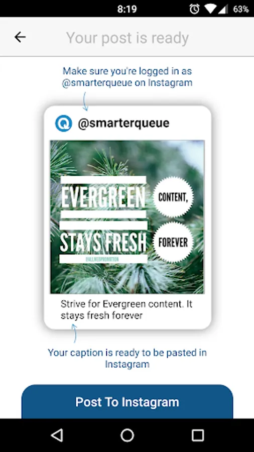 • Click to open Instagram with your media pre-loaded, and your caption in your clipboard ready to paste.