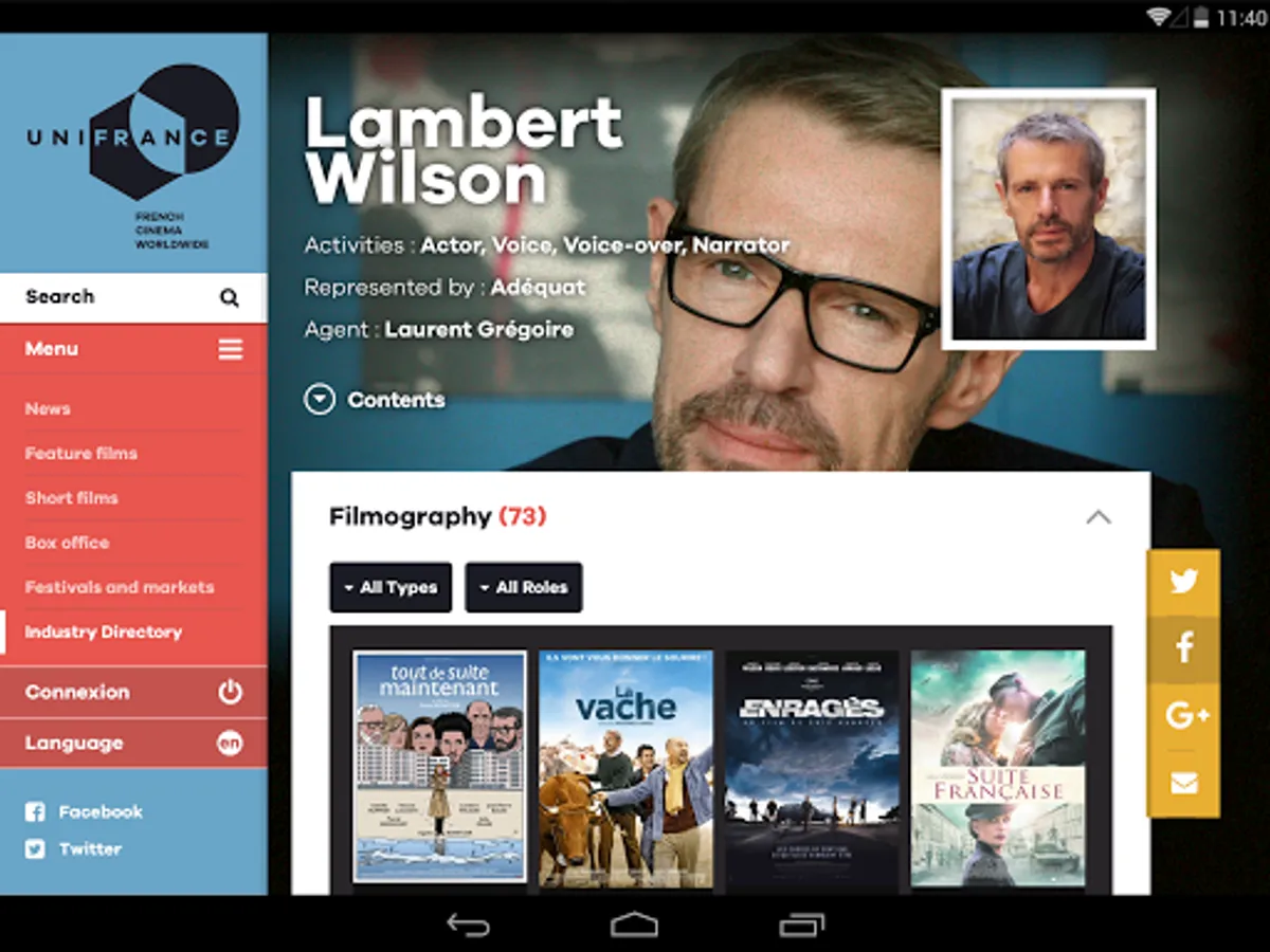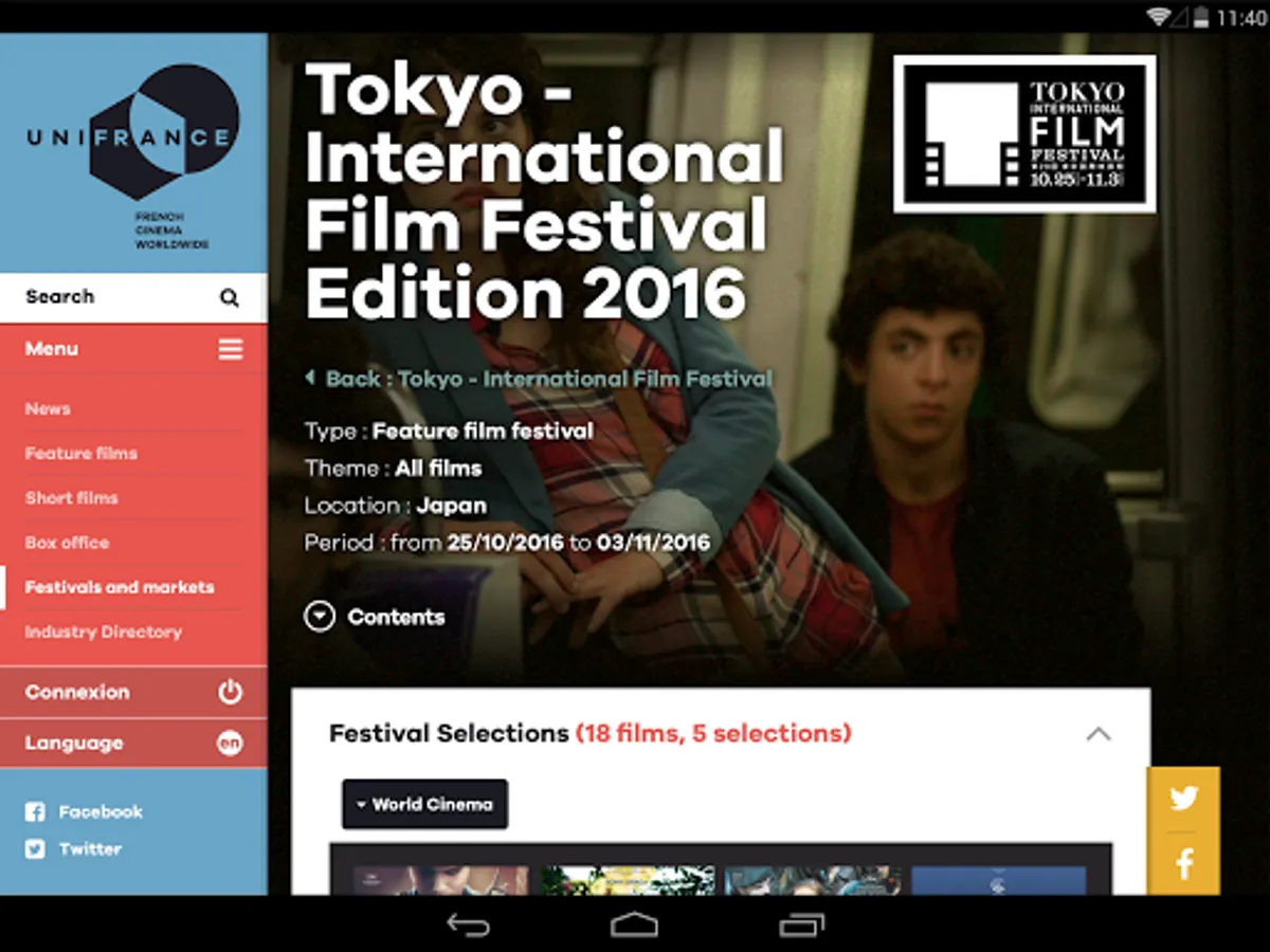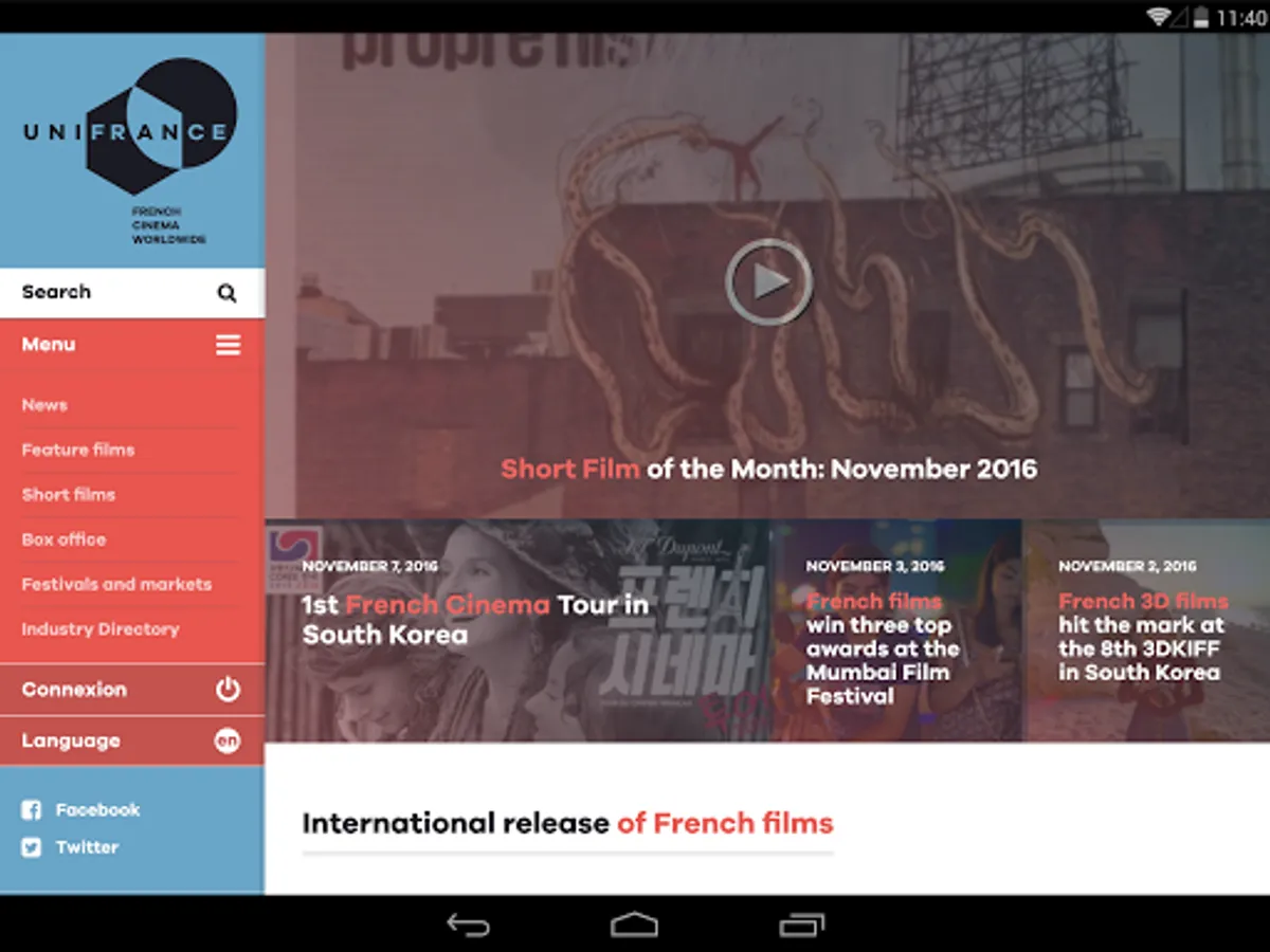 The "UniFrance" app - free and trilingual (French, English, Spanish) - is intended for film industry professionals and the general public alike, and allows for a total immersion in the world of French cinema and its international reach and impact.