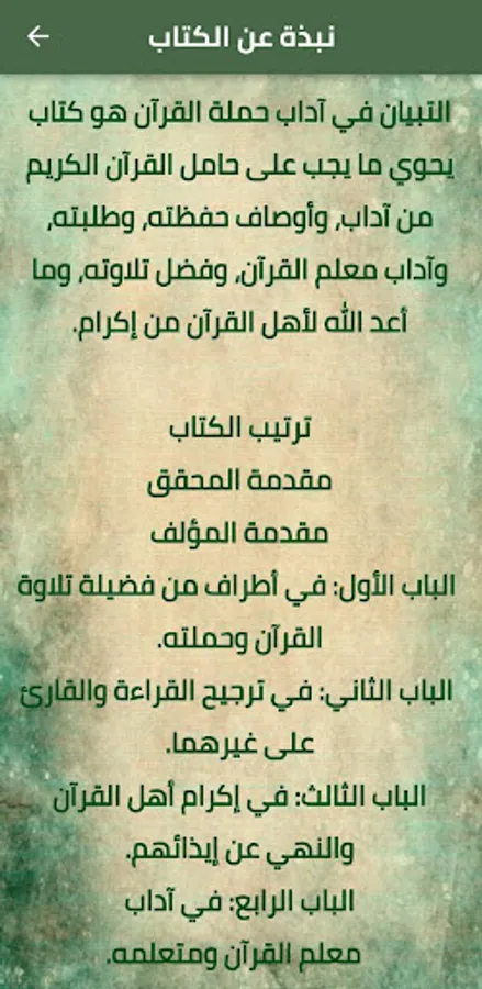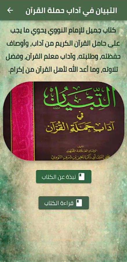 The application of Al-Nawawi's Book of Etiquette in the Ethics of the Qur'an Campaign pdf contains a glimpse of the book, and you can read the book with the letters enlarged and reduced in order to suit your eyes and vision.