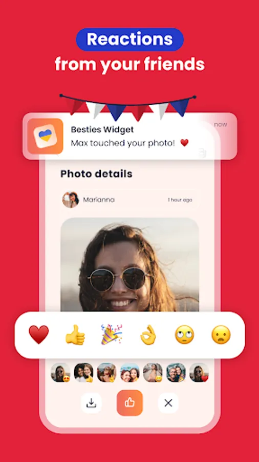 Send a photo to a friend's widget and get an emoji reaction, so they know seen their picture. They’ll get a notification, and you’ll love watching the emojis rain down on your photo.