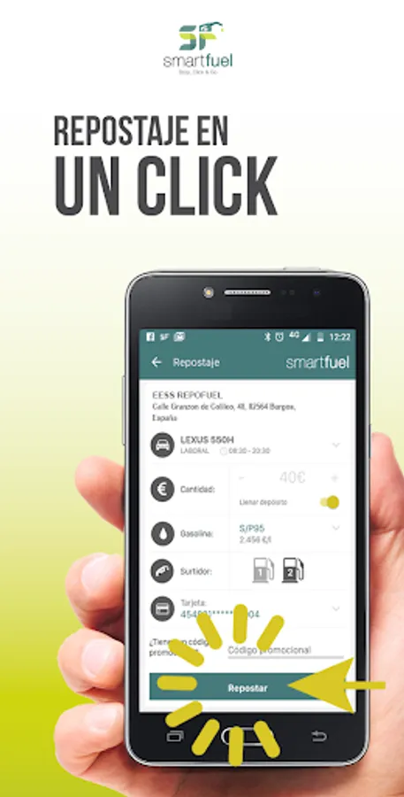 Smartfuel is the only fuel refueling app with which you can pay in just one click and without leaving the vehicle. Turn on the Bluetooth of your smartphone and the pump will detect you. If you have already refueled at that gas station before, with a single click, you can refuel the same amount again.