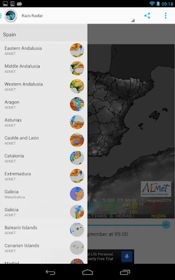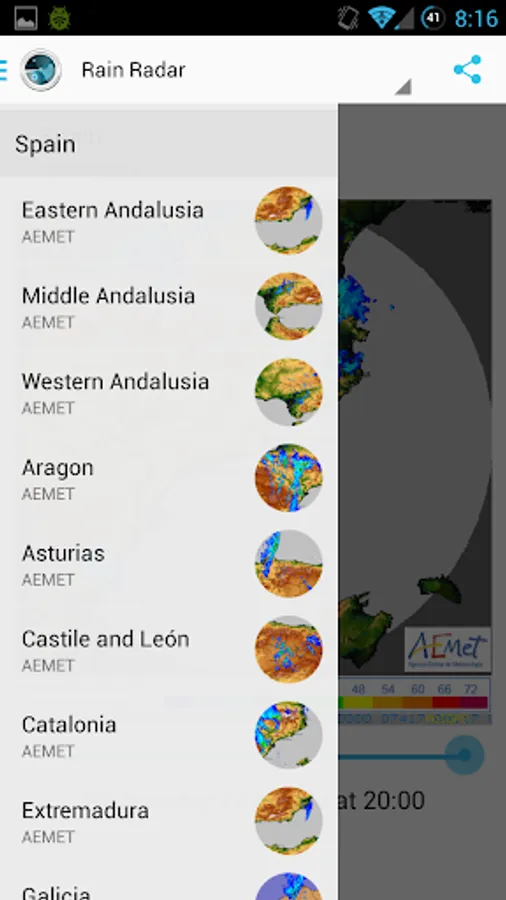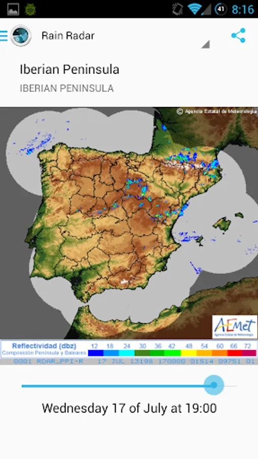 - Rain radar images: by the AEMET and MeteoGalicia, for the Iberian Peninsula, Portugal, Spain and most of its regions