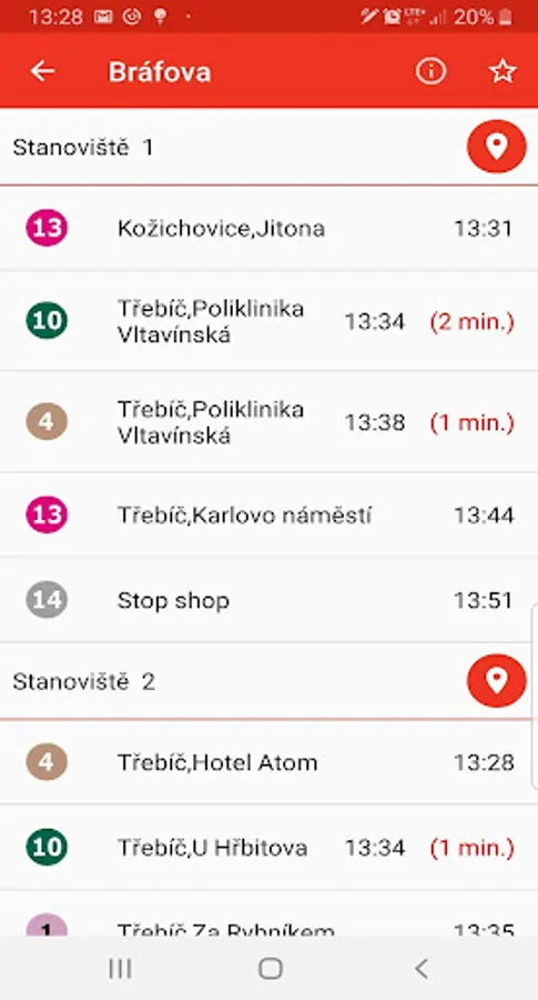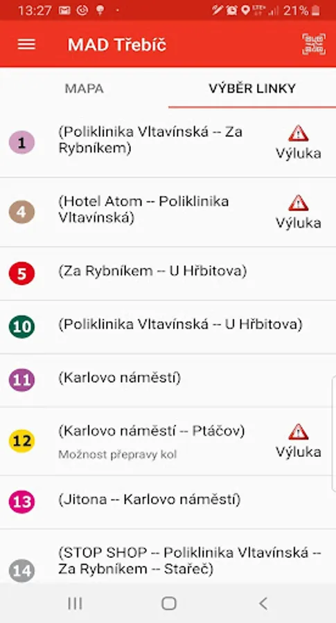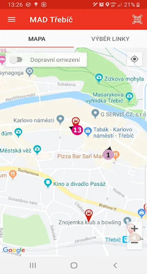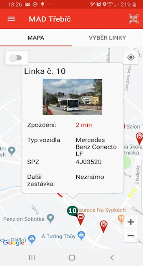 Application for monitoring the positions of city bus connections in Třebíč on a map background with filtering by line number. You can view the vehicle's photo, license plate and current delay on the link.
