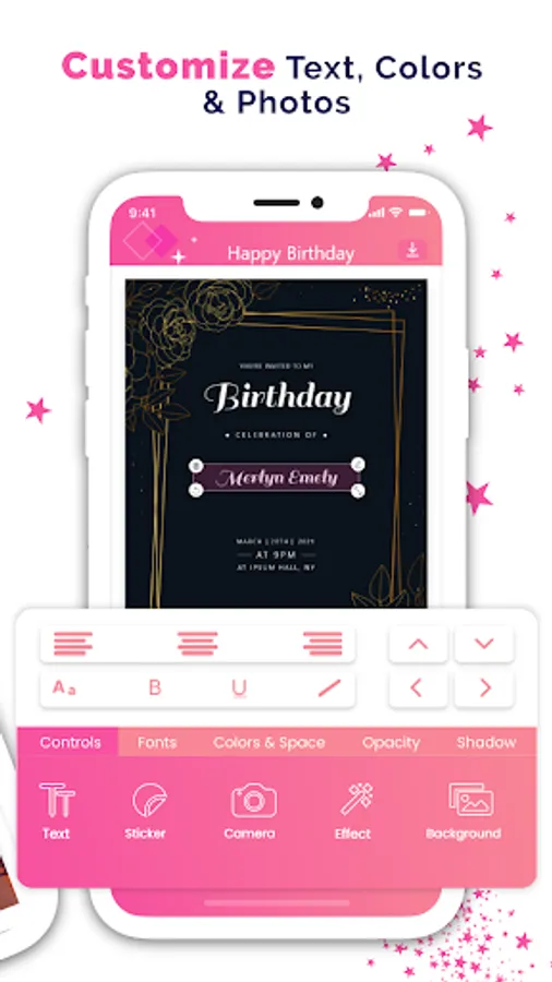 Use our online card maker to create invitation cards for different joyful occasions and make the event colorful with e cards. This app uses an online database for data backup so don't worry about the size of the application. Invitation card maker will not affect your mobile memory at all.