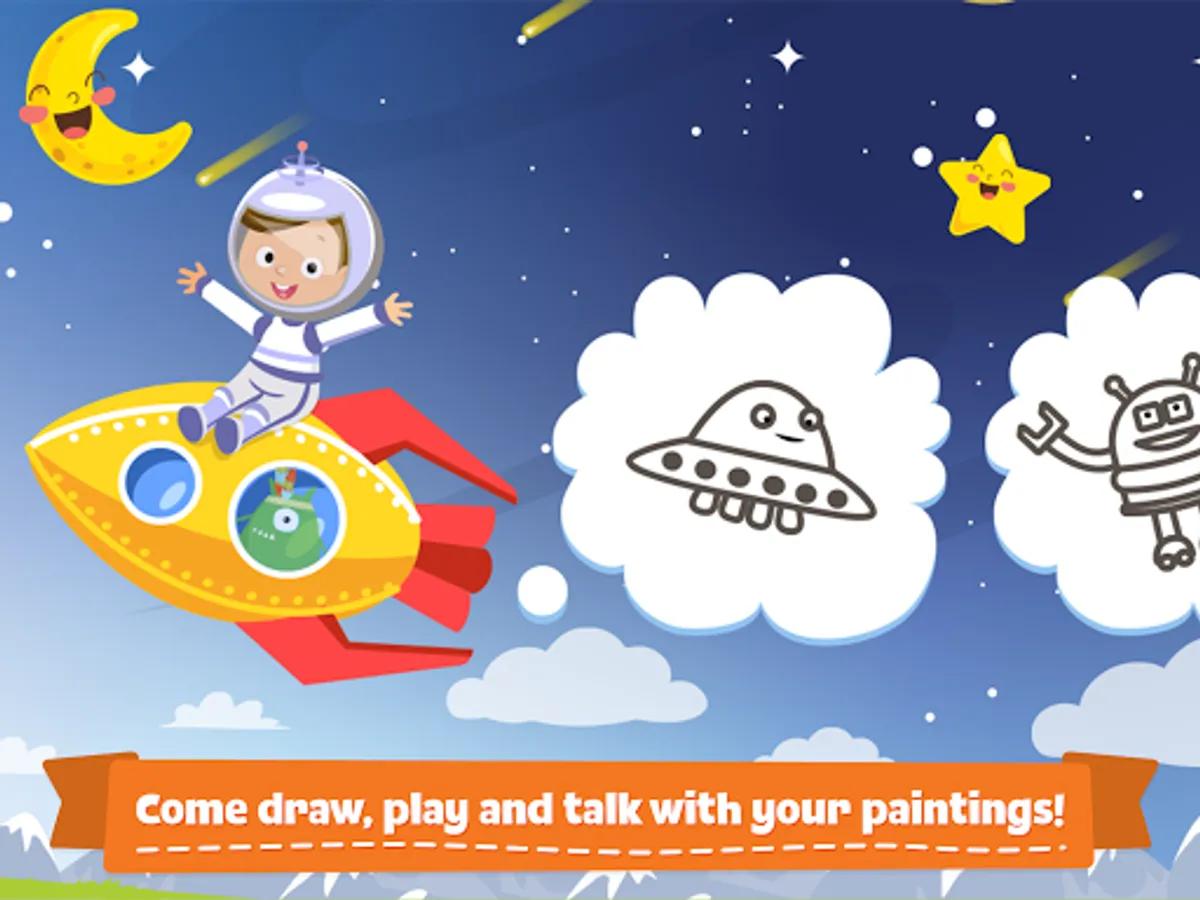 And what about doing the same with a cute funny robot? Or a friendly train? Or maybe your kid would love to draw a kitty or a dog or even a dinosaur and then to play and talk with them? No problem – lots of drawings for boys and girls from pets to a unicorn, from a car, a robot to an UFO.