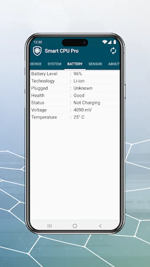 - BATERY (level%, technology, health, voltage, temperature, etc. )