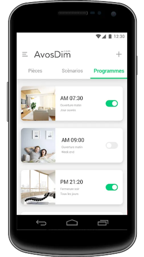 The AvosDim Mobile App allows the management & free piloting of AvosDim wireless shutter & blind motors from a smartphone. Download this Mobile App for free and create an account. It only remains to link your engines in a few clicks and configure scenarios at leisure! Use of the Free App, without subscription. The AvosDim App is able to: • Control up to 30 motors • Control up to 20 pieces • Make up to 20 scenarios • Make up to 20 programs Convenient, you activate your saved scenarios in the Assistant App Alexa and Google Assistant when you have it. An RS485 interface is integrated in the AvosDim 005313 box, which offers an additional integration option in third party home automation systems. 4 - ICON ON APPLE DOWNLOAD PAGE 5 - BACKGROUND PICTURES SHOWED ON G.PLAY DOWNLOAD PAGE 7 - WEBSITE www.avosdim.com 8 - EMAIL info@avosdim.com 9 - PRIVACY POLICY: https: / /avosdim.com/conditions-generales-vente#condition13