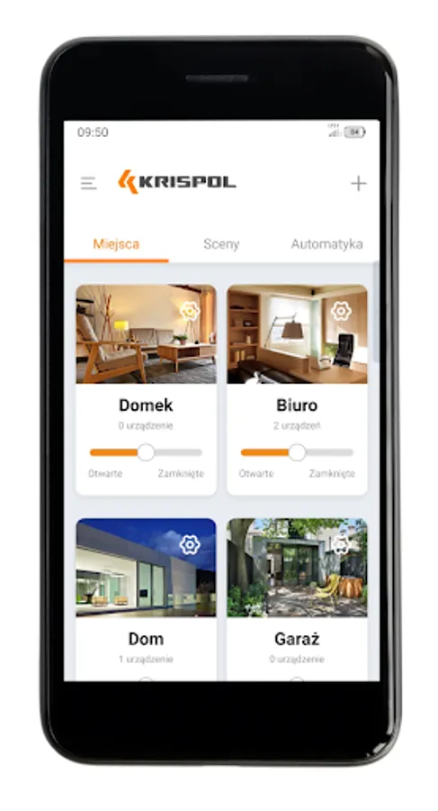 The "myKRISPOL" application enables a more free control of motorized roller shutters, external blinds and garage doors with a smartphone. Before use, set up an account in the "myKRISPOL" application, with Wi-Fi Hub "STARCUS CONNECTOR" or Wi-Fi module "STARCUS GATE CONNECTOR"