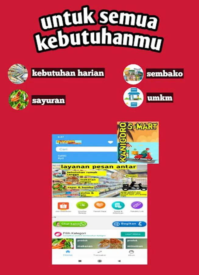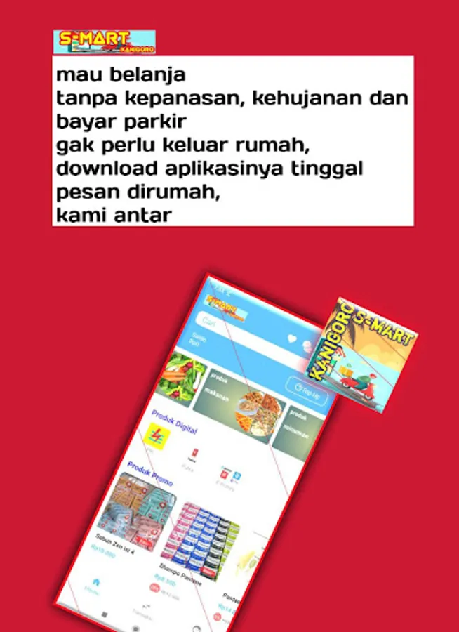 S-mart kanigoro is a special delivery application for basic needs of the community. With the Kanigoro S-Mart application you don't have to worry about overheating, rain and paying for parking anymore. There are always promo products every day.