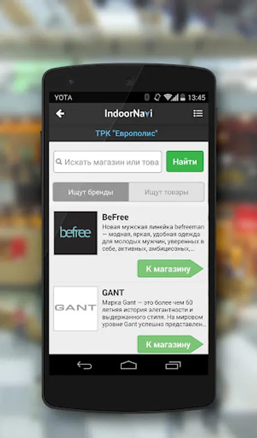 The application helps you to find any shop, product, ATM, WC, cafe or restarant inside the malls of St-Petersburg, Russia. At the moment we support detailed maps of 2 huge malls: