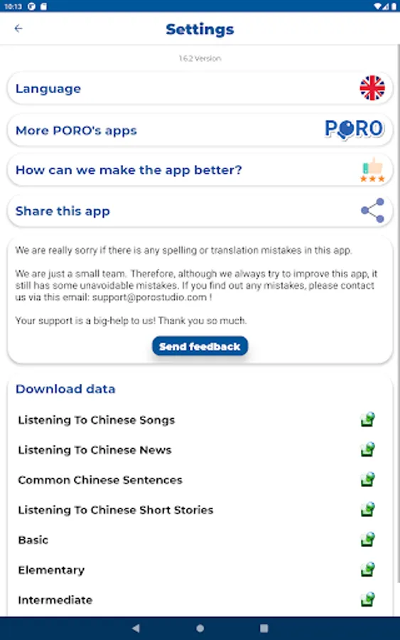 “Learn Chinese - Listening And Speaking” App is still in the developing process, so we hope to receive your contributed comment to make it better. We are a team that loves the Chinese language and always try to share our love with the community, so if you like this app then please take a moment to rate 5 stars for it! You can also contact us by commenting or clicking the feedback button on the options screen.