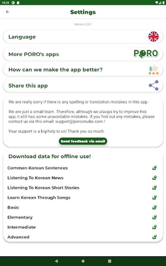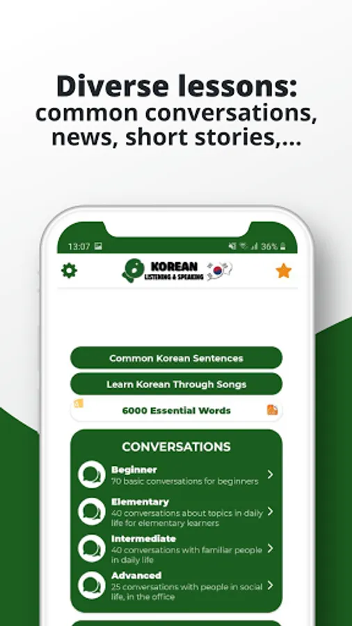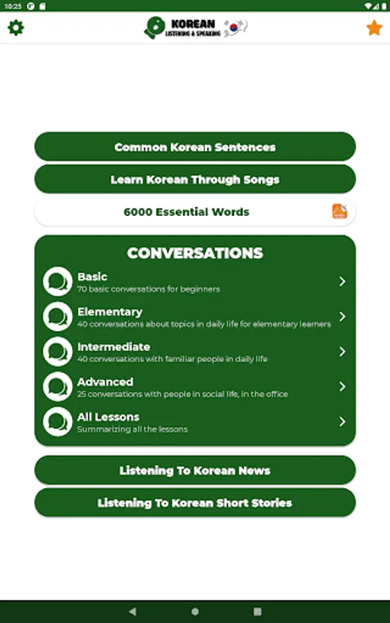“Learn Korean - Listening And Speaking” App is still in the developing process, so we hope to receive your contributed comment to make it better. We are a team that loves the Korean language and always try to share our love with the community, so if you like this app then please take a moment to rate 5 stars for it! You can also contact us by commenting or clicking the feedback button on the options screen.