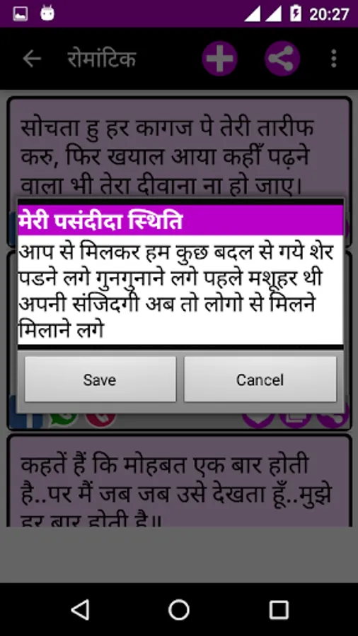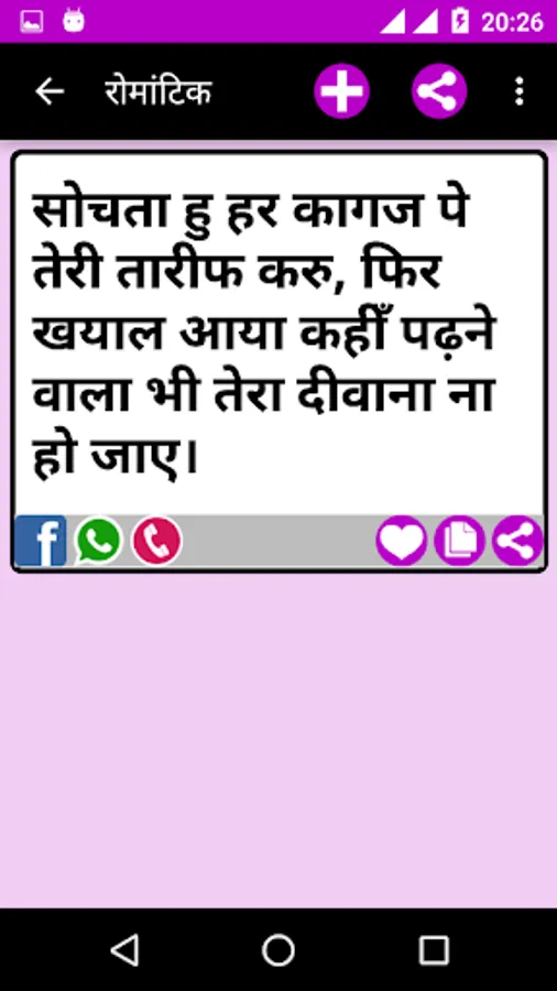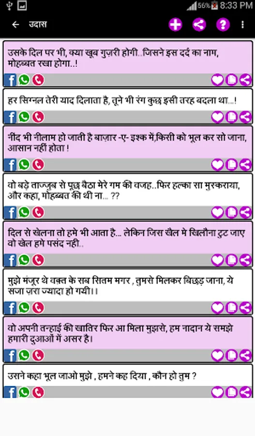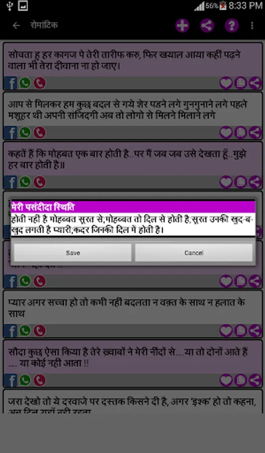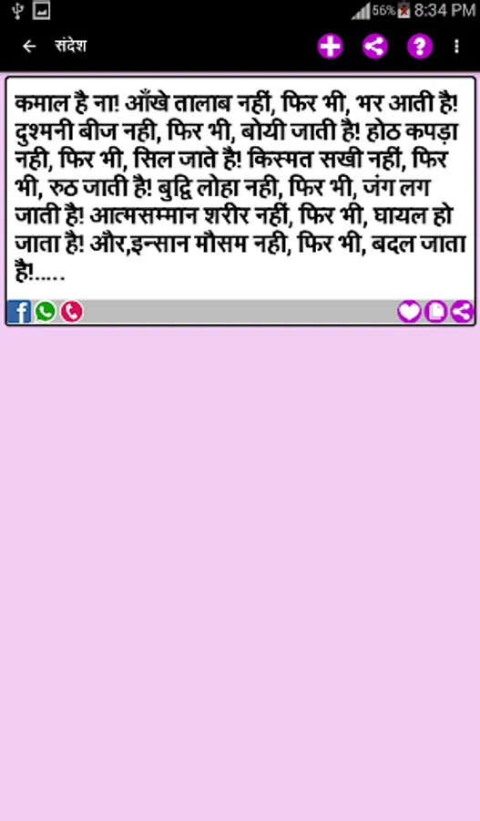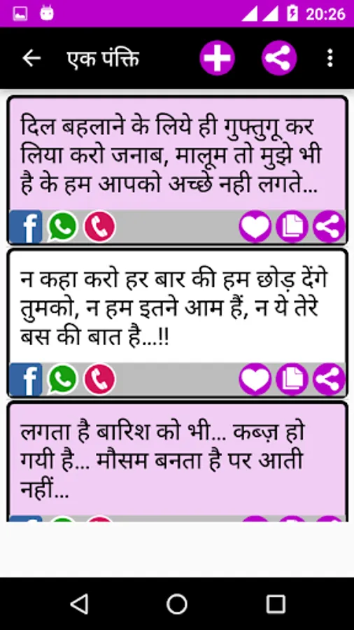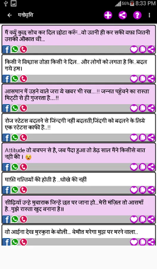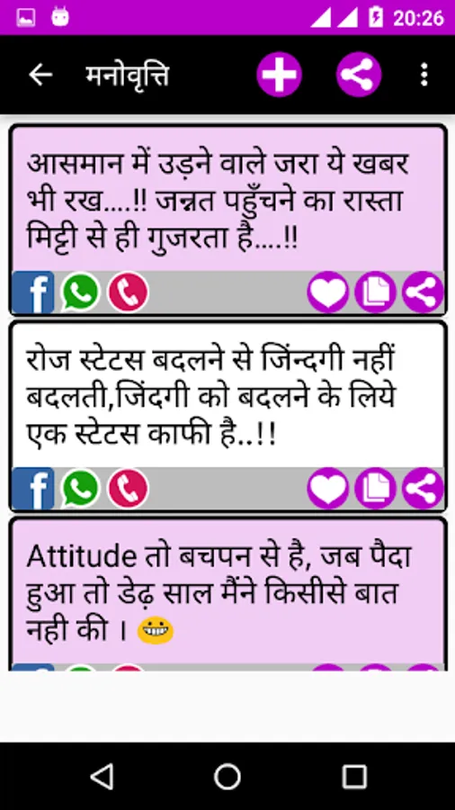 This App has the largest collection of beautiful Hindi Status Messages for every occasion to share with your loved ones on all Social Networking Sites, chats, SMS and E-mail, etc.