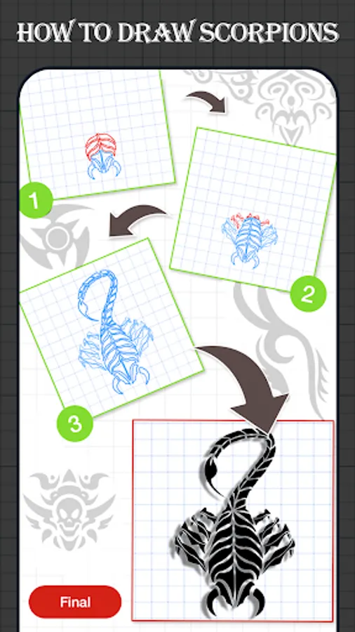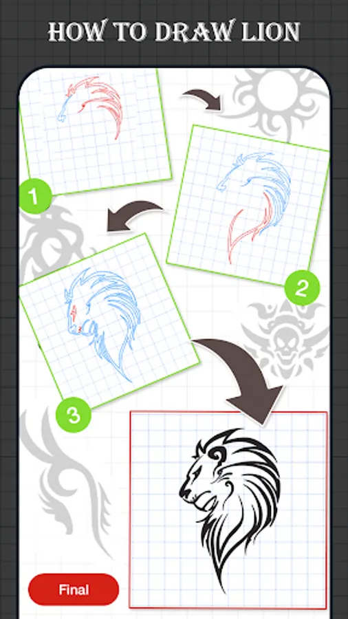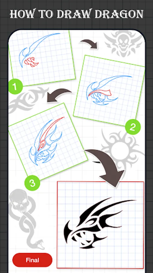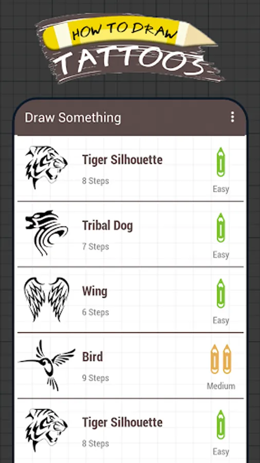 Each drawing is divided into few steps, and it is easy to follow so this app shows you how to draw tattoos step by step easily.
