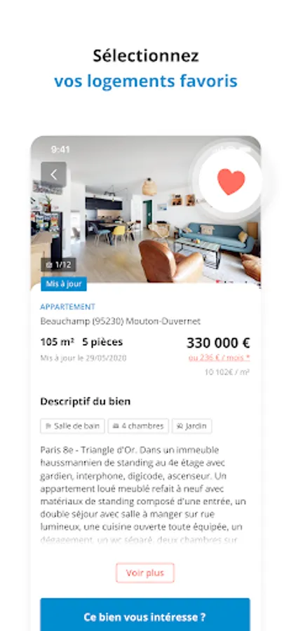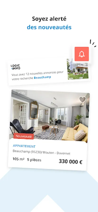 Who says new application, says new interface! We have reworked the Logic-Immo experience for a simpler and more efficient search. Direct access to the latest announcements from your recorded searches, quick connection with real estate professionals to plan your visits and increasingly relevant search criteria.