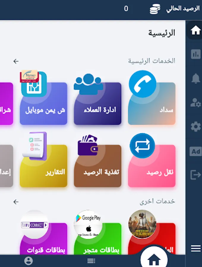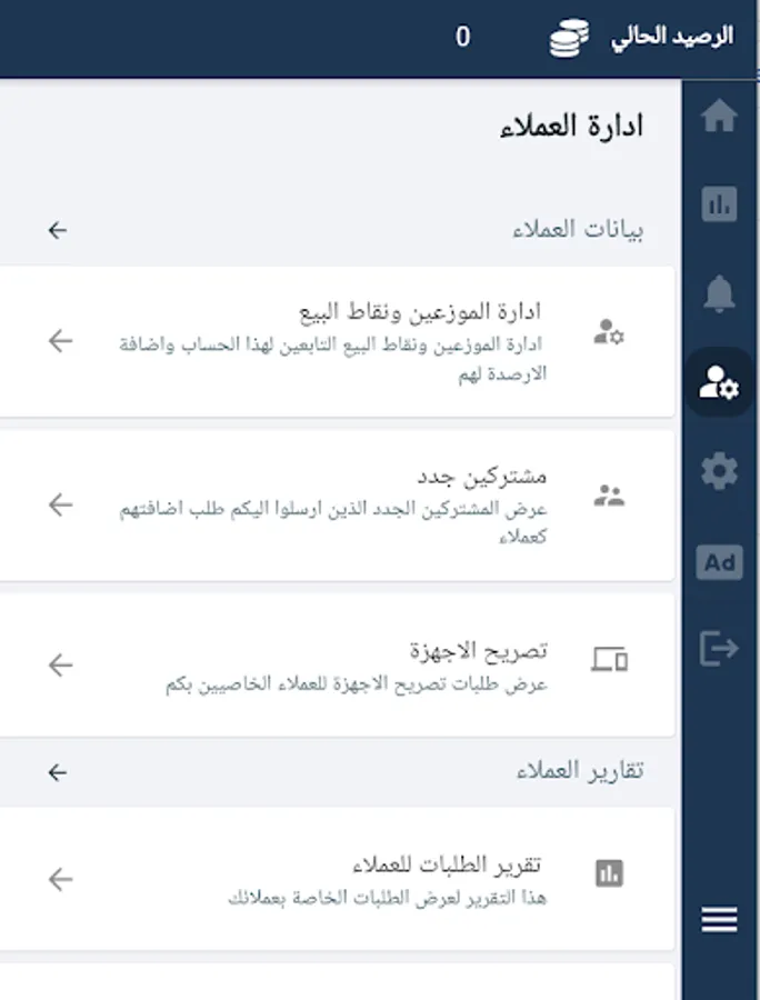 One application for all levels where the agent and also the distributor can enter the application with his personal account and make direct payments without the need to open a point of sale.