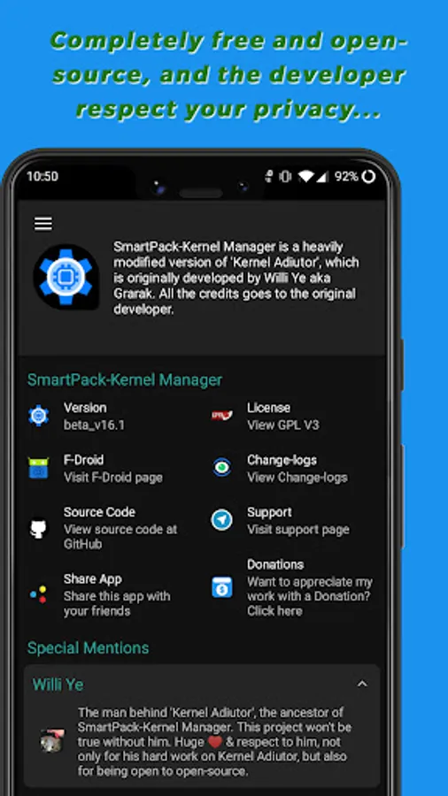 This is a 'Pro' version of SmartPack-Kernel Manager, the heavily modified version of Kernel Adiutor developed by Willi Ye, published mainly with the aim of supporting the development of this project. The original developer (Willi Ye) deserved due credits, not only for his hard work on Kernel Adiutor, but also for being open to the open-source community. If you don't want to pay for this app, feel free to build it from its source code, which is publicly available at: https://github.com/SmartPack/SmartPack-Kernel-Manager