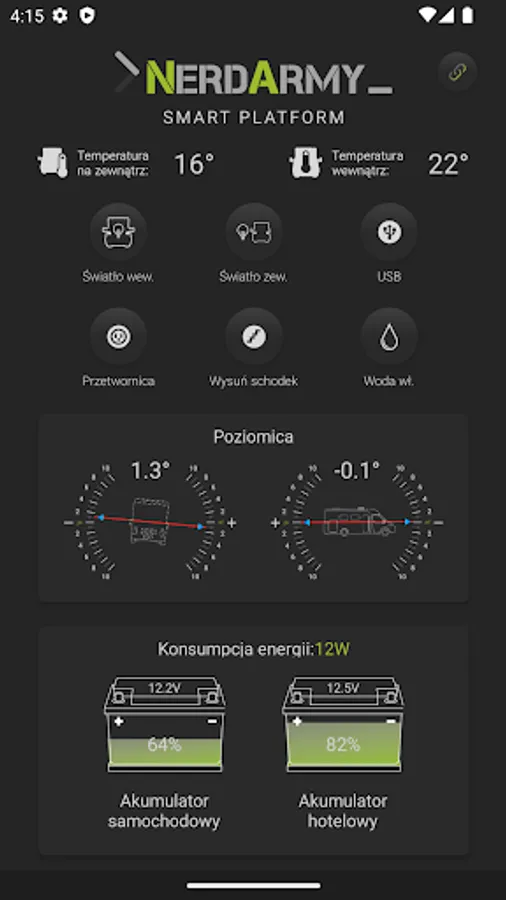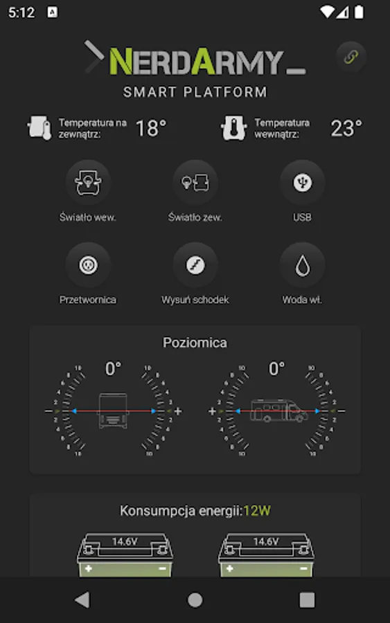 The Nerd Army Smart Platform Mobile App is an application to operate a recreational vehicle equipped with the Nerd Army Smart Platform system on board. It allows you to monitor the battery charge status, energy consumption by the vehicle, view status icons (clean water tank, gray water tank, GPS, LTE, charging from the engine, charging from the 230V charger, connection to an external 230V power supply, vehicle in motion, water system on / off, DC/AC voltage converter on / off). In addition, it is possible to view environmental parameters: temperature inside and outside the vehicle. The application also gives you the ability to start the system via the master ON / OFF button and control the on-board devices (ON / OFF): internal lighting, external lighting, USB sockets, DC / AC voltage converter, automatic step, water system. In addition, the application has a visualization of a virtual spirit level used to level the vehicle at a standstill.