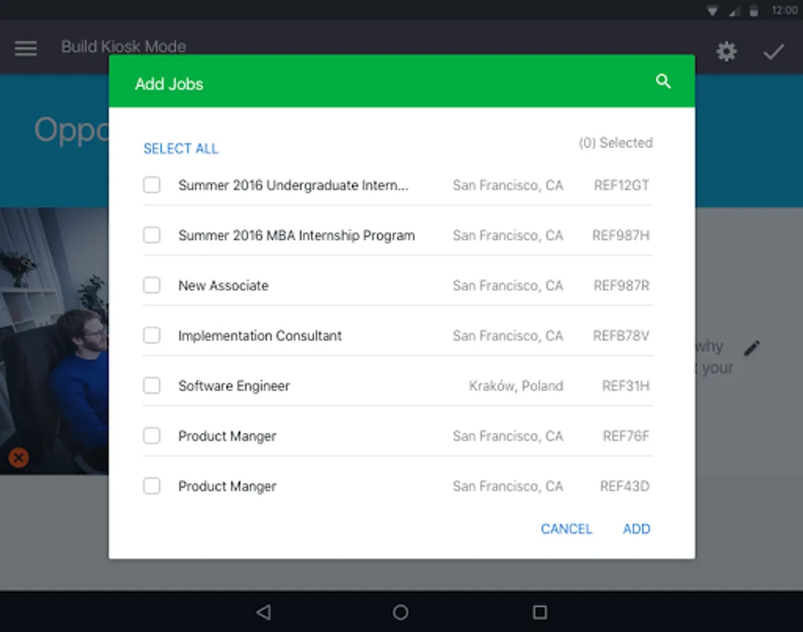 SmartRecruiters’ Field recruiting App allow companies to setup a digital kiosk where recruiters can: