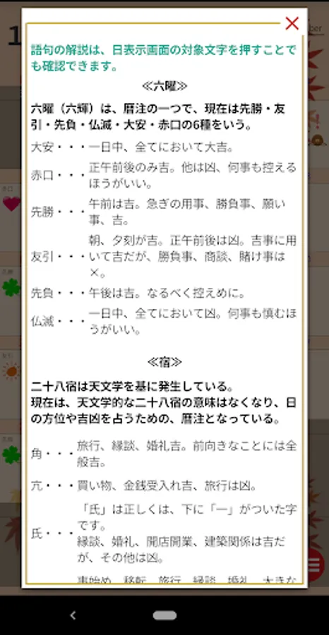In addition, for each phrase (Rokuyo, Twelve Nao, Twenty-eight Inns), explanations are displayed by tapping the letters.