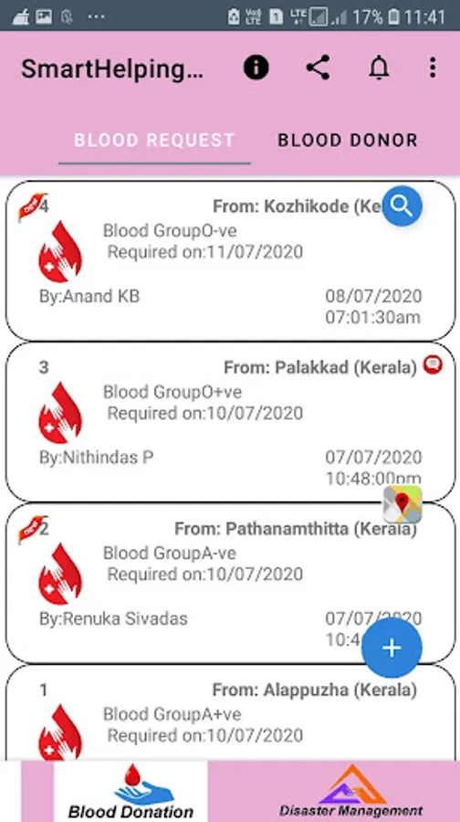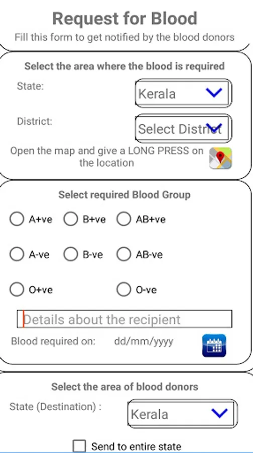 1. BLOOD DONATION: This section deals with blood requests and blood donors. When a person in need of blood, he can send this information through the app by selecting the area of blood donors. The blood donors will get a notification from the app when somebody requests for blood. The blood requests and blood donors can be tracked using the provided map. Search options are given for locating the blood requests and blood donors based on area, date and location in the map.