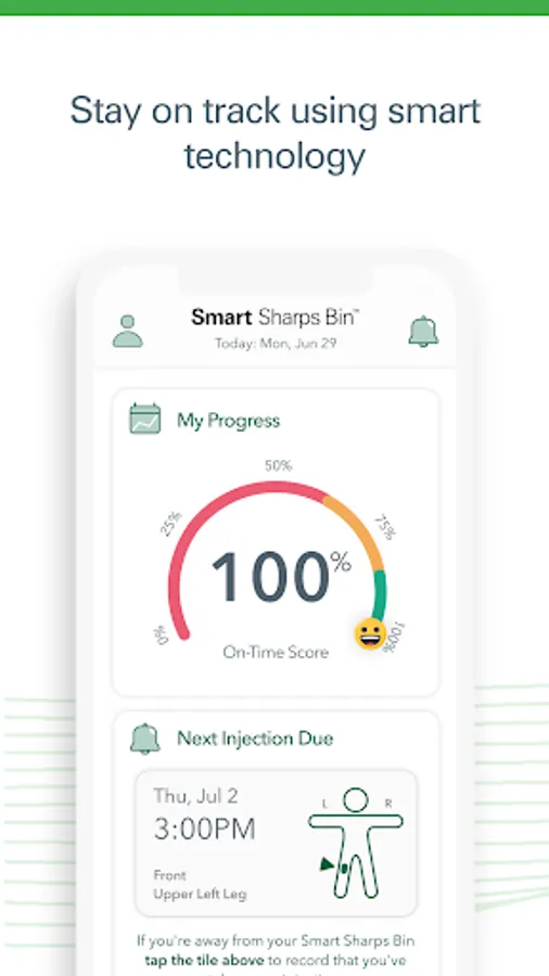 GET MOTIVATED: Your On-Time Score automatically updates each time you drop an injector in Smart Sharps Bin