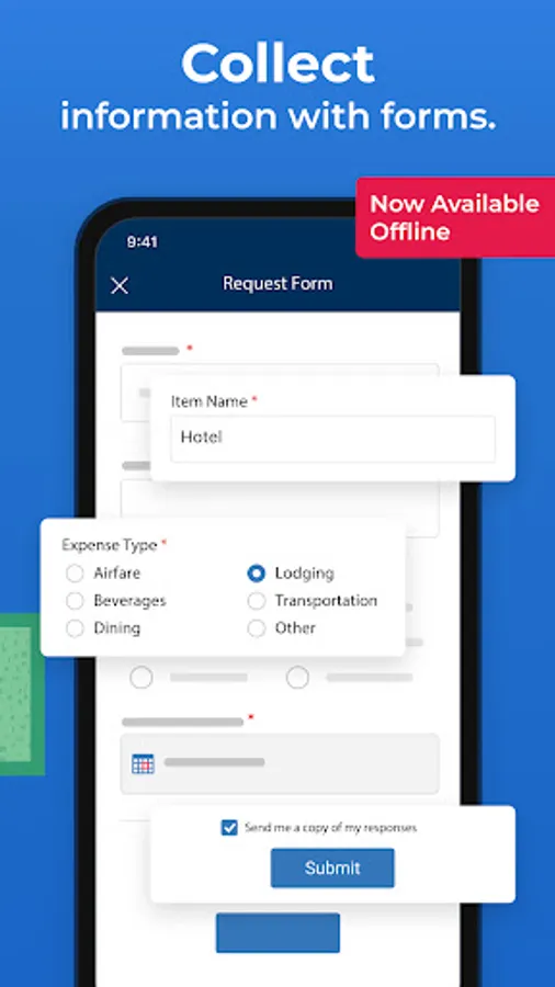 • Collect data from the field with forms, capture and upload images, or scan barcodes.