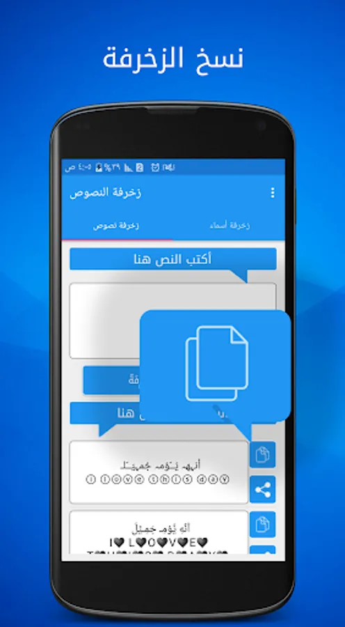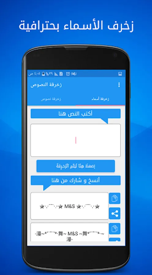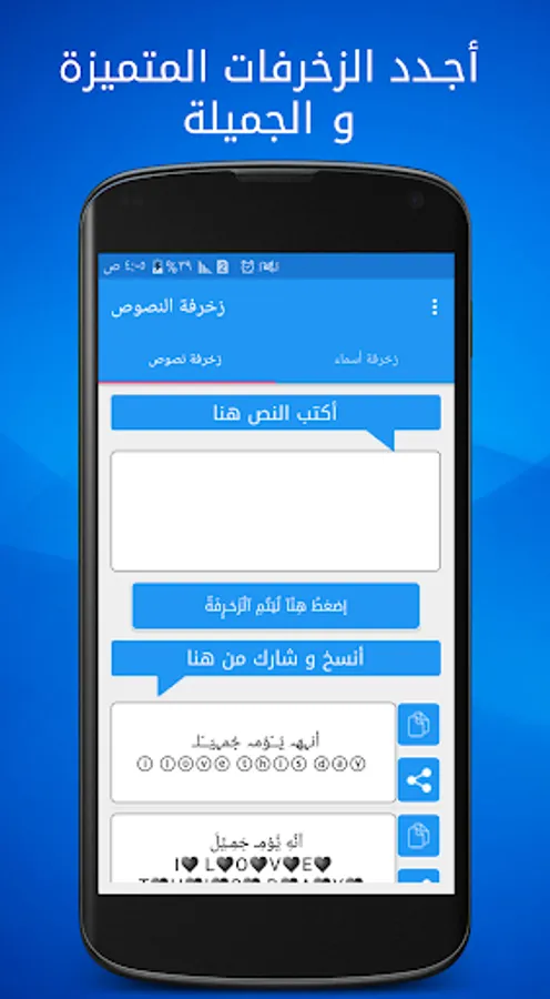 Writing ornament and decoration writing as you like there are many forms of text and decoration and ornament professional and as application supports late and distinctive ornament names and symbols and forms Facebook ornament and decoration Facebook line ornament English and Angelaza parsed and as you can through the program formation letters and letters decorated as you wish feel free to download the application Zgervh You through the program, the formation of words and the formation of Albroodcast can copy the text by pressing the back button or post text on social networking sites like Facebook and applications of communication such as Watts, a father and Facebook and there in pictures application photographs show, it also can be used to send texts ornate decorated mobile messages to friends and share across Facebook as a publication garnished