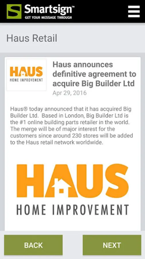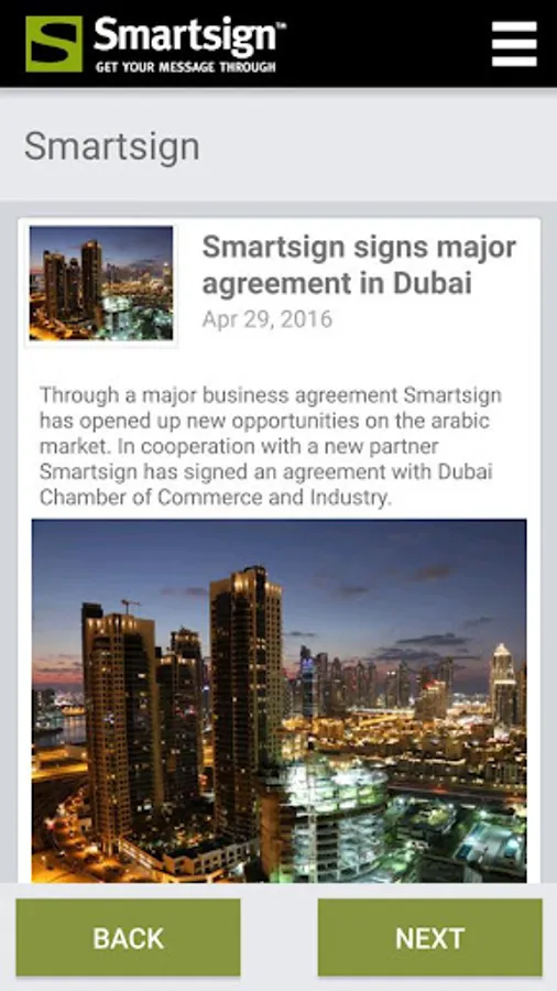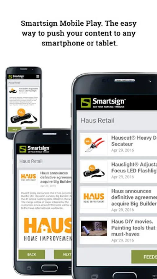 The latest Smartsign Display Manager upgrade premieres Smartsign Mobile Play. A built-in system for pushing text, images, audio, video and documents to any smartphone running the new Smartsign Mobile Play app for Android. This is an easy, immediate and effective way to keep coworkers and employees up to speed. As a content publisher, Smartsign Mobile Play lets you push whatever content you want to the mobile device of any recipient or recipient group. Faster than email, cheaper than text messaging.