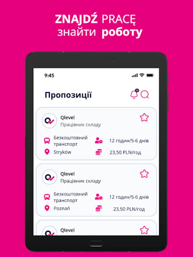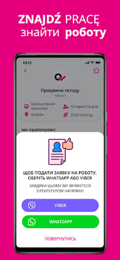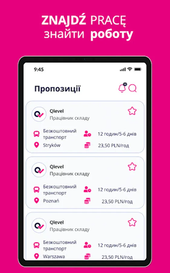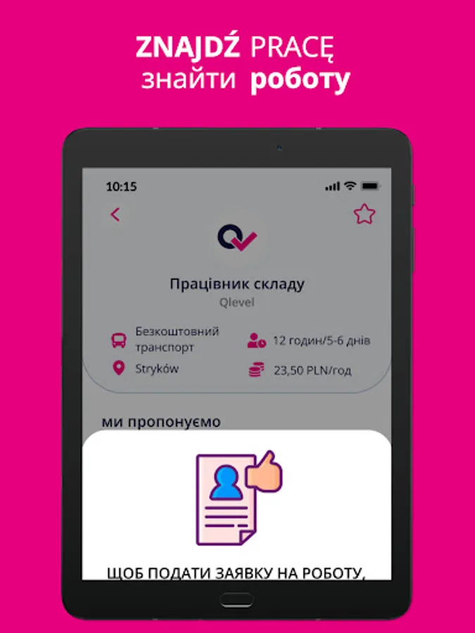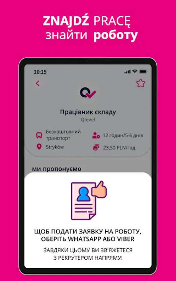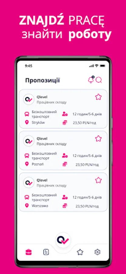Find your dream job in Poland without leaving your home! Get information about the latest job offers that match your qualifications and interests. Our app will connect you with our coordinators using popular messengers like Viber or WhatsApp, who will help you with all the formalities involved in getting started. With the Qwork app, you'll find a job that's right for you.