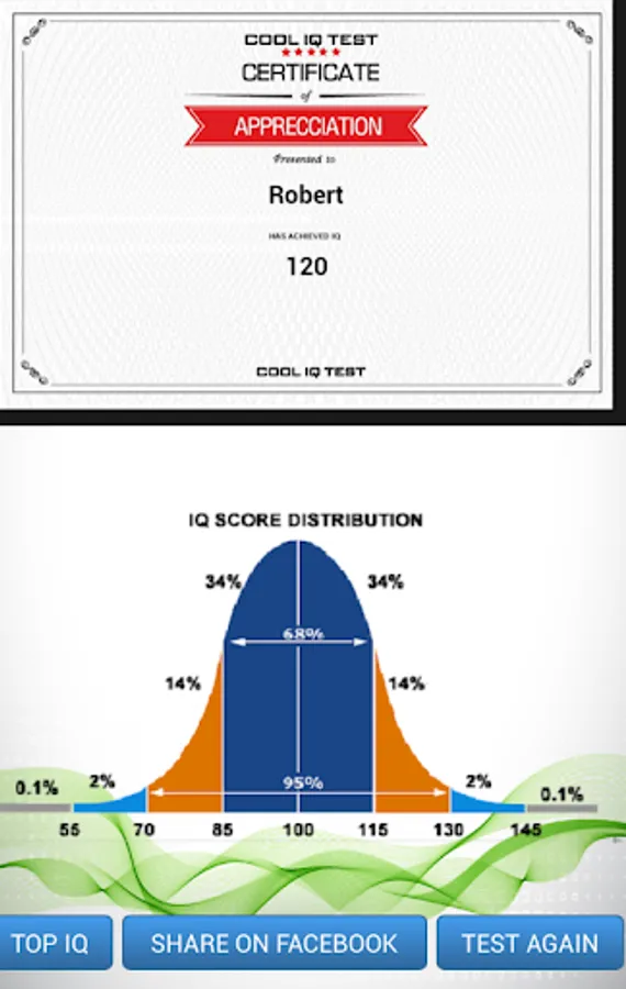 Do you ever ask yourself 'what's my IQ?'? Do you want to compare your IQ to your friends IQ or especially famous celebrities such as Albert Einstein? Cool IQ Test will answer these questions for you. Every test IQ in Cool IQ Test is developed with the aim of measuring your Intelligence Quotient (IQ) include logical, memory and mathematics questions. You have 20 minutes to finish 20 questions test IQ, If you are not sure about certain questions, you can skip them first and move on to those when you are confident about. After you have completed the test IQ, Cool IQ Test will create an IQ certificate for you and you can share this certificate on Facebook or Twitter and wait for admiring comments from your friends or event sometimes you must utter “Whoa! I’m a super genius, my IQ’s equals to Albert Einstein’s IQ ”.