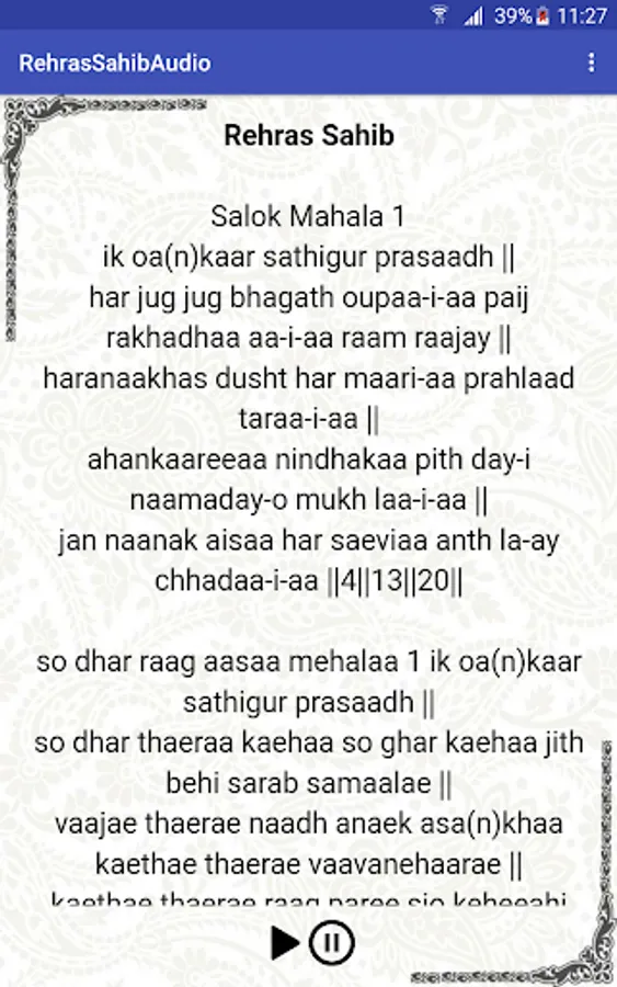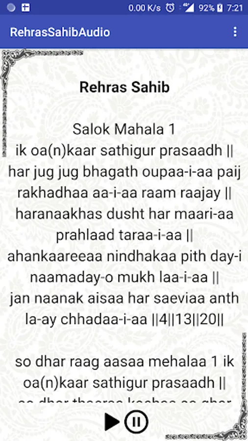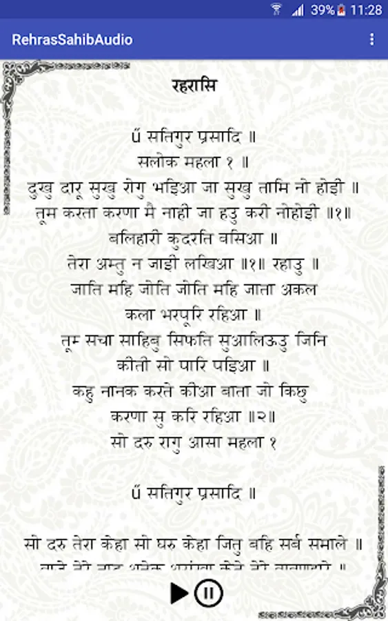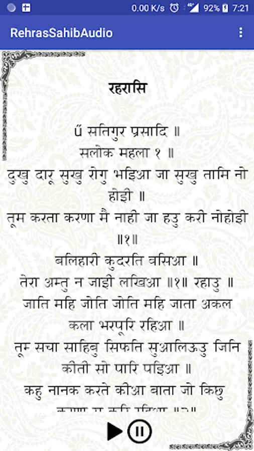 Rehras Sahib Audio Path Android App provides you read and listen to Rehras Sahib Path on your mobile. In this Android App, you can read "Rehras Sahib Path" in Punjabi, Hindi and English language.