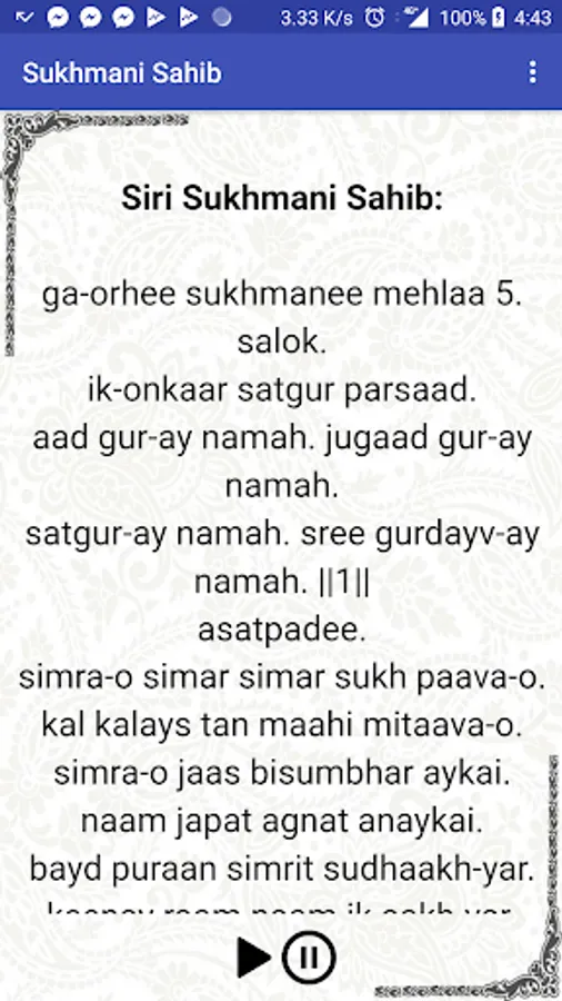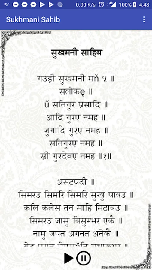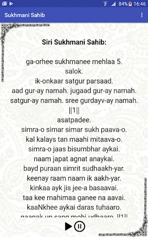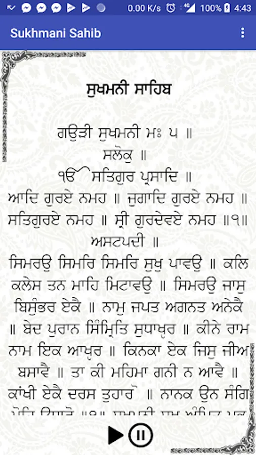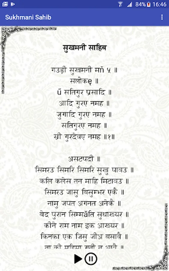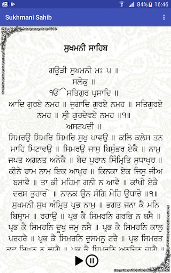 Sukhmani Sahib Path Audio App in Punjabi, Hindi, English (Gurmukhi) Sikh Prayer. Sukhmani Sahib Path Audio Android App provides you read and listen to Sukhmani Sahib Path on your mobile. In this Android App, you can read "Sukhmani Sahib Path" in Punjabi, Hindi and English language.