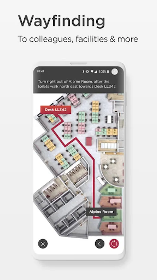 By incorporating superior visual maps, point-to-point wayfinding, reservation and check-in functions the app connects your employees to the people, places and information that matters.