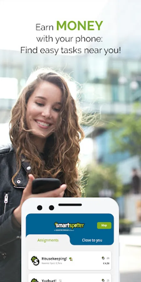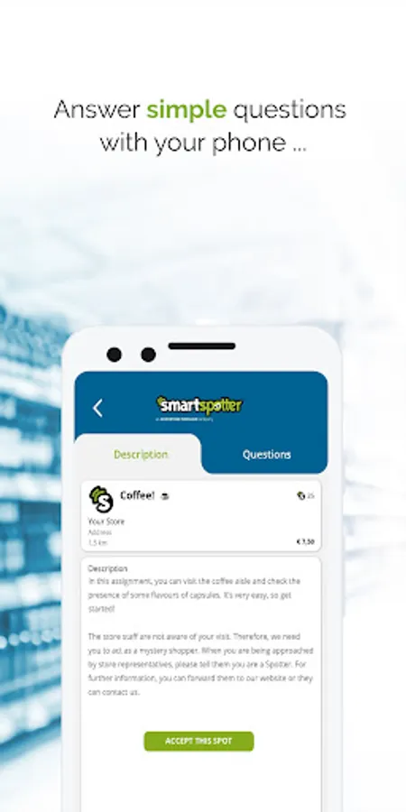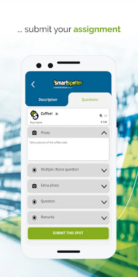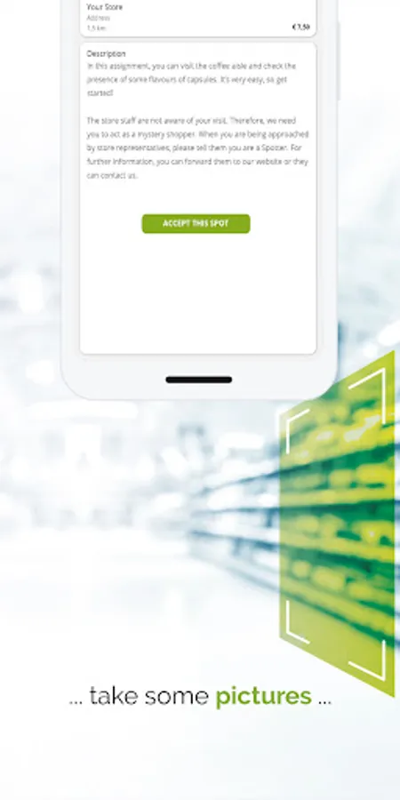 3. Choose your assignment: New assignments appear in the app on a daily basis. Look for fun assignments in your area and carry them out in return for a nice reward! For example, take photos of a certain window display, enter the product prices in-store or evaluate shop floor promotions. Earn money and SmartPoints without for every Spot completed!