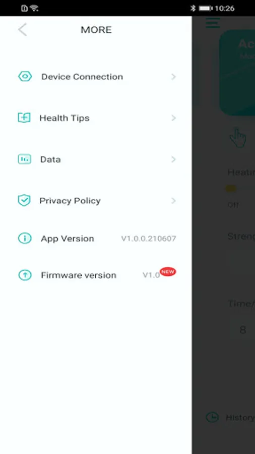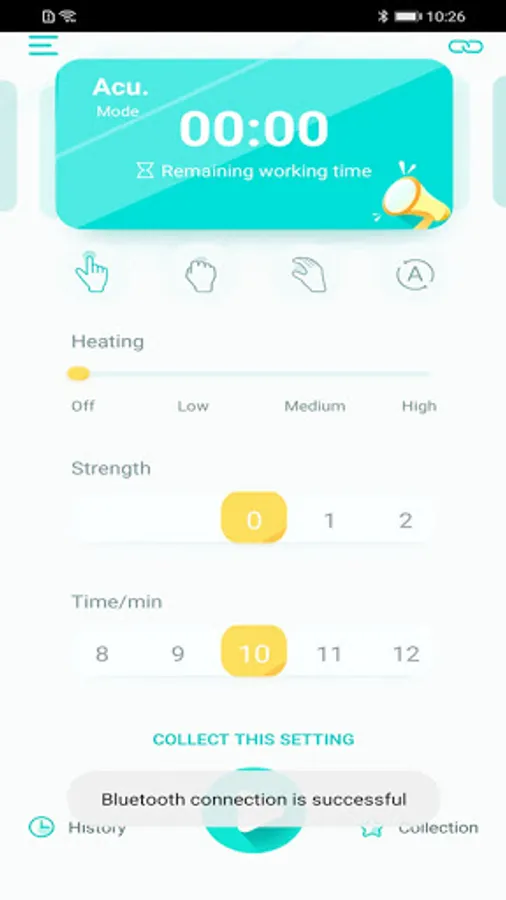 An APP for use with stylish smart neck massage equipment. After connecting with the supporting smart device, you can experience the smart device with multiple modes, multiple intensity, and multiple time periods through this APP, and you can collect your favorite massage methods, view the history of massage methods and statistics of the last eight massage methods.