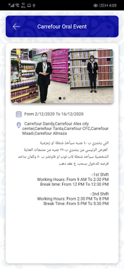 automatically log check-in time once the agent arrives to the assigned promotion location, and check-out when the agent get out the defined zone, the agent also will be forced before record any check in to take a selfie picture to report the grooming to the managers