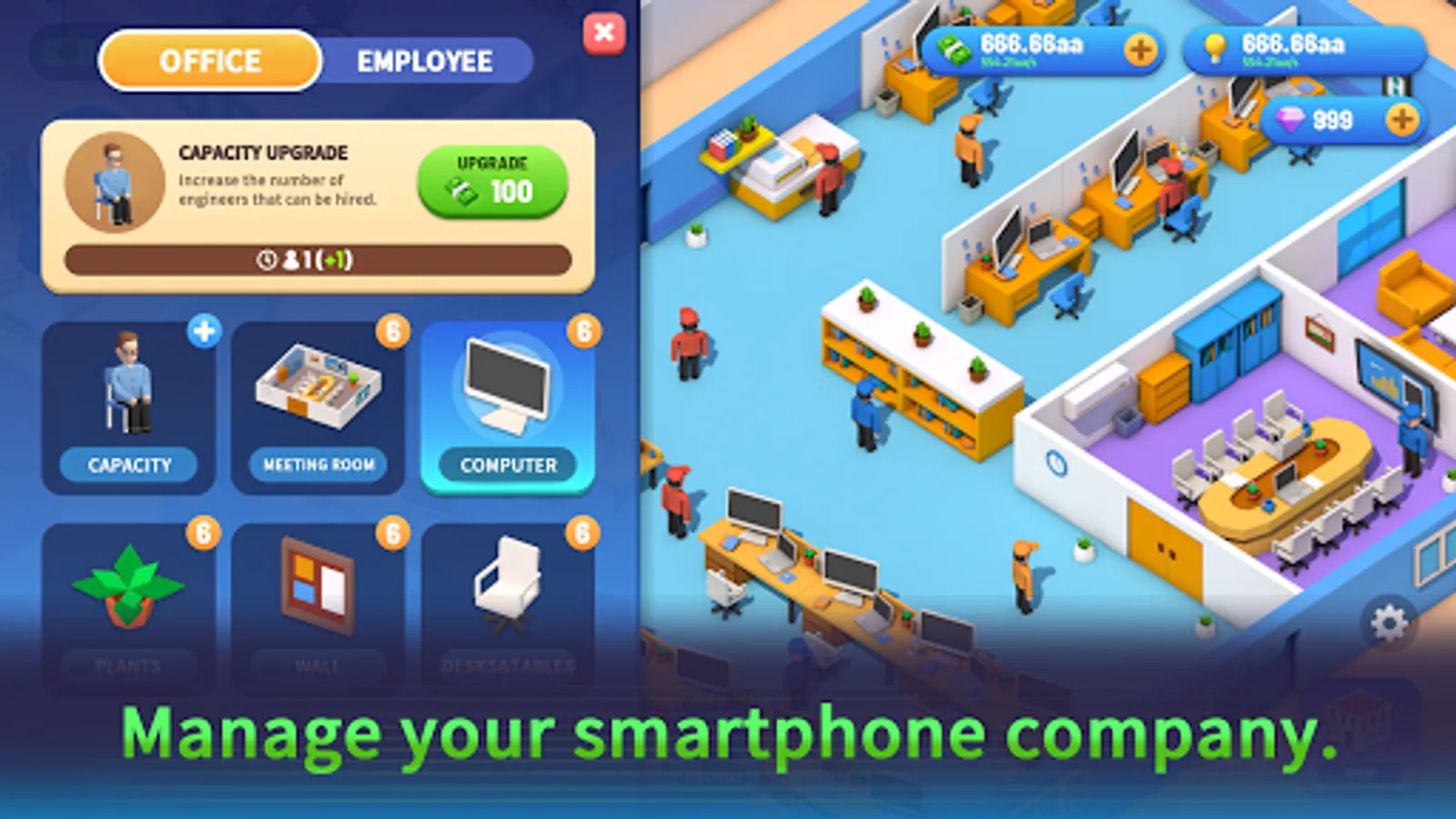 Smartphone Company is an easy and fun game. You start and run your first company with your partner in a dilapidated garage. It is a nice game for everyone who are interested in designing mobile phones or manage a company. You can create and design your own smart phones. Remember to upgrade your office and hire more talents so that your company will grow faster.